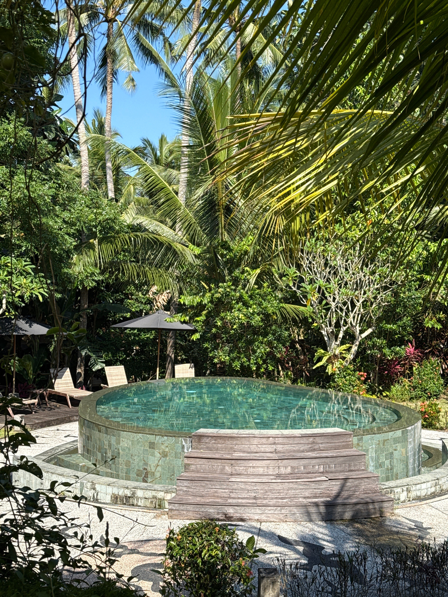 This vivid photograph captures a serene tropical landscape, likely a resort or private villa, under bright daylight. The scene is dominated by lush, verdant foliage and a distinct swimming pool, conve…read more