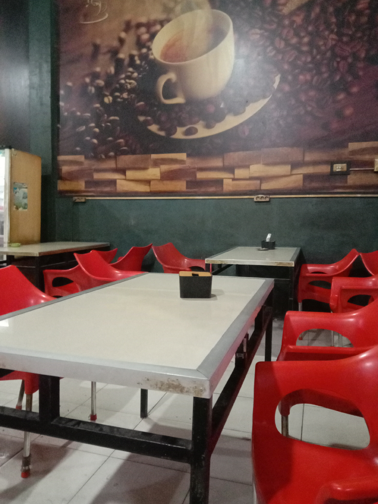 The image displays the interior of an empty coffee shop or cafe, likely located in Lhokseumawe, Indonesia. The setting appears casual and functional, awaiting customers. In the foreground and centralβ¦read more