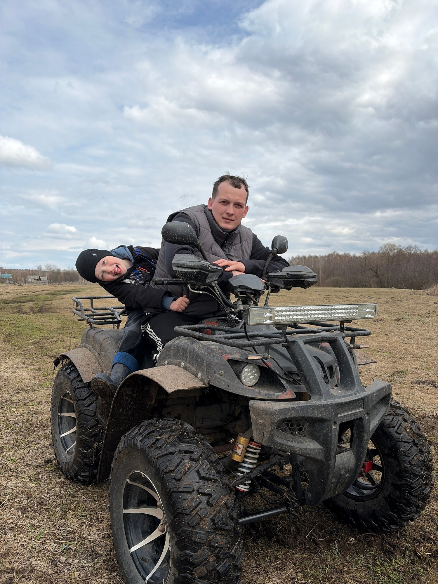 Two individuals, likely a father and son, are positioned on a black ATV in a field near Кемуль, Russia. The ATV's tires appear muddy. The sky is overcast. The father sits on the ATV with the child in…read more