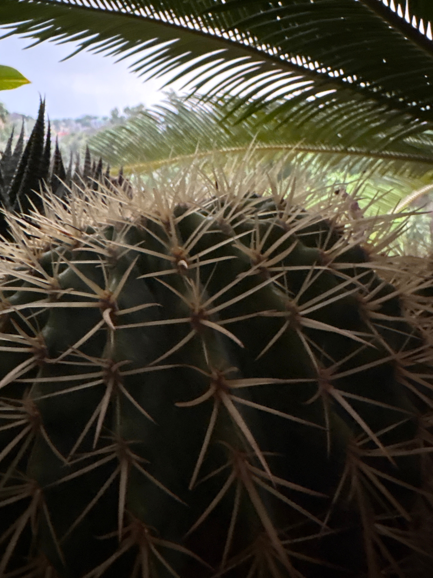 The image shows a close-up of a cactus, likely a barrel cactus, with long, pale spines covering its surface. The cactus is positioned next to a fern-like plant with long, thin fronds visible on the le…read more