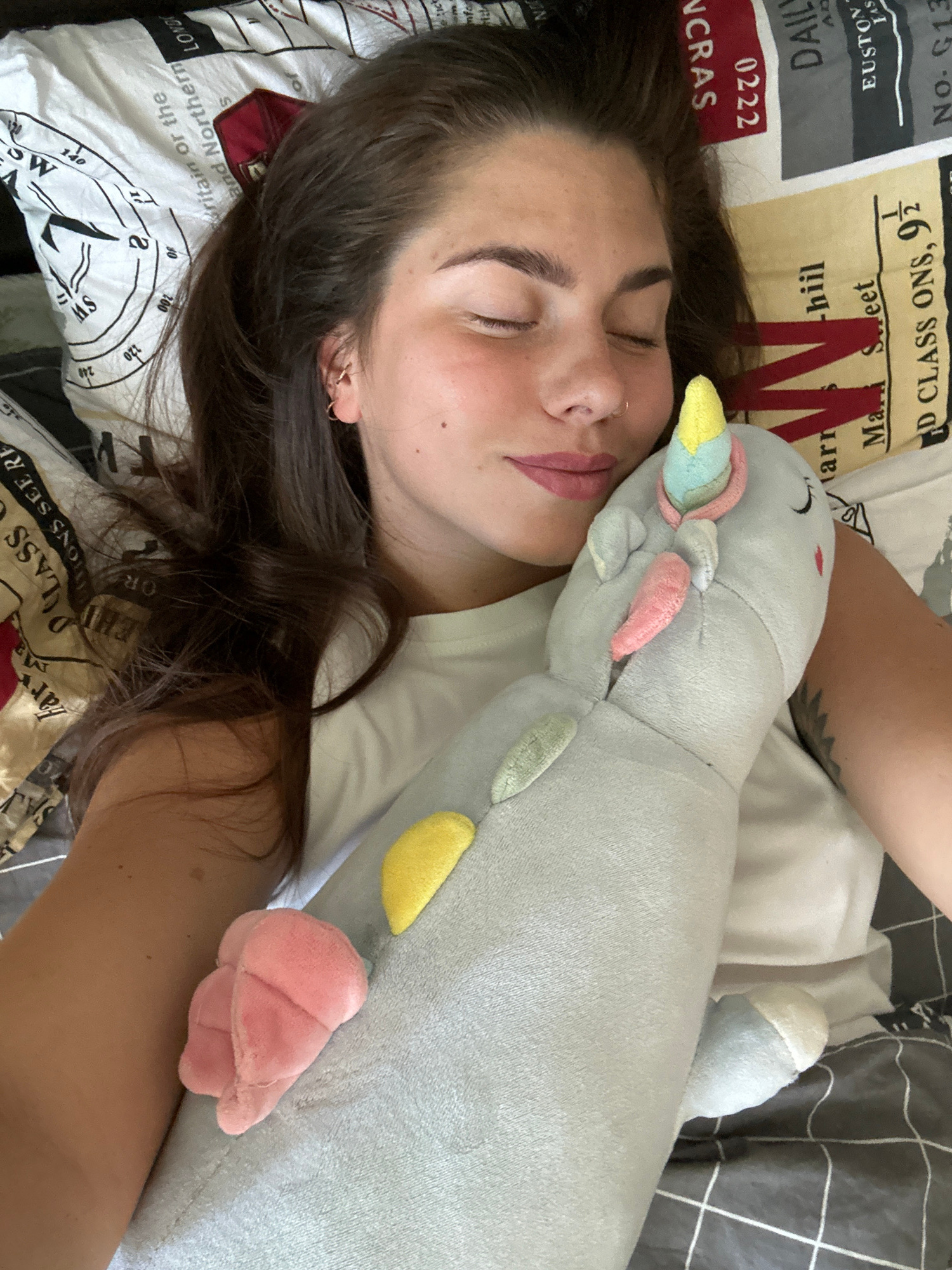 A woman is lying on a bed. She is cuddling a plush unicorn. The bed has patterned linens depicting various London place names (Euston, St. Pancras). A grey plaid blanket is also visible. The woman app…read more