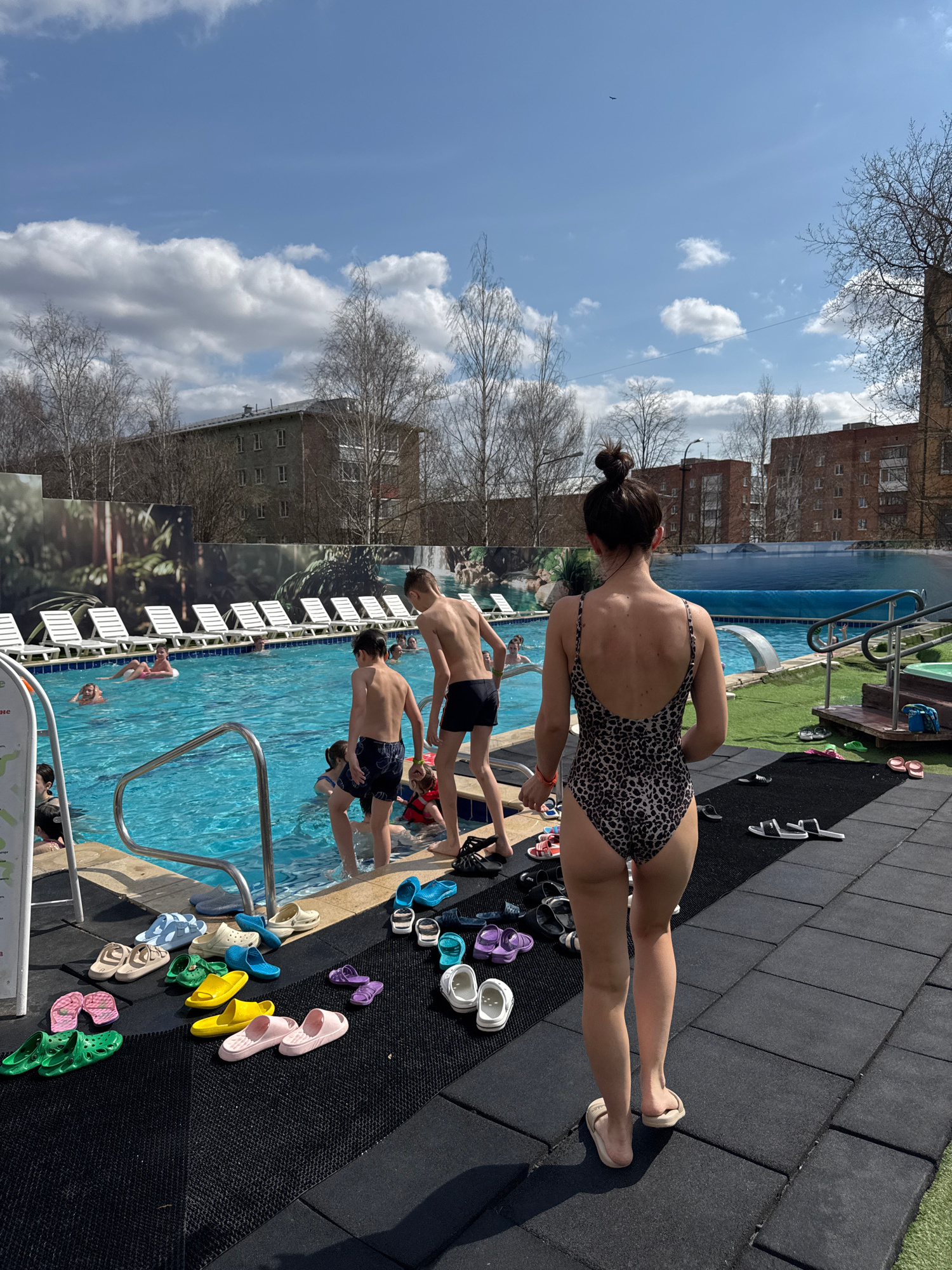 The image shows an outdoor swimming pool in Votkinsk, Russia. A woman in a leopard-print swimsuit stands at the edge of the pool. Two boys are about to enter the pool. People swim in the pool. Many pa…read more