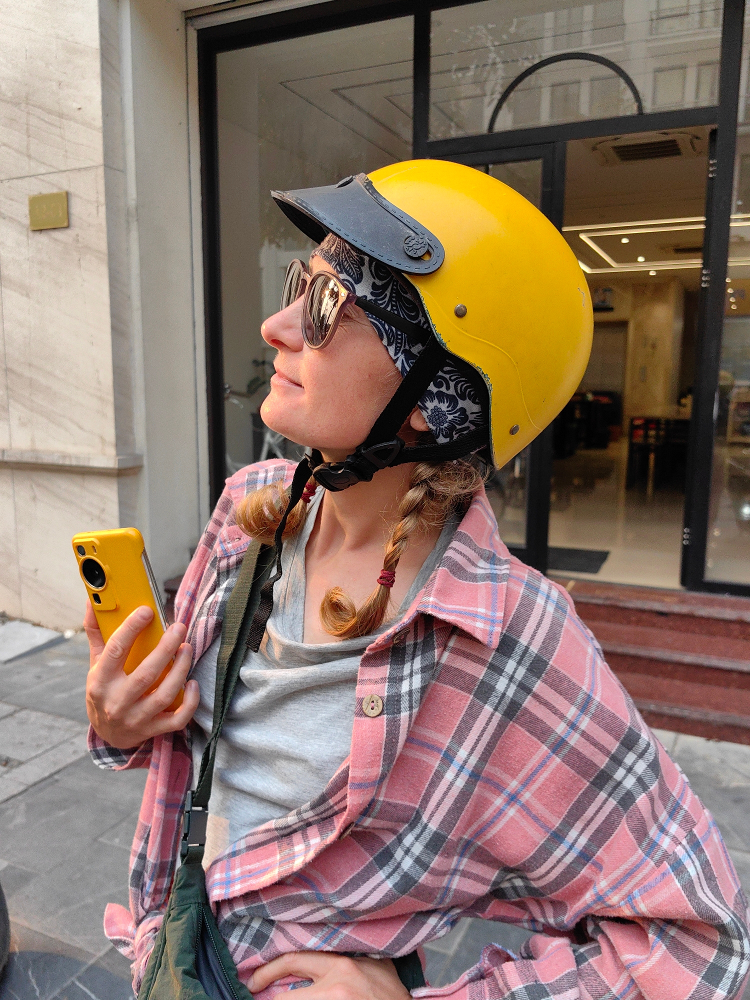 A woman stands in Hong Gai Ward, Vietnam, wearing a yellow helmet with a black visor and paisley-patterned head covering. She has blonde braids and sunglasses. The woman wears a gray t-shirt under an…read more