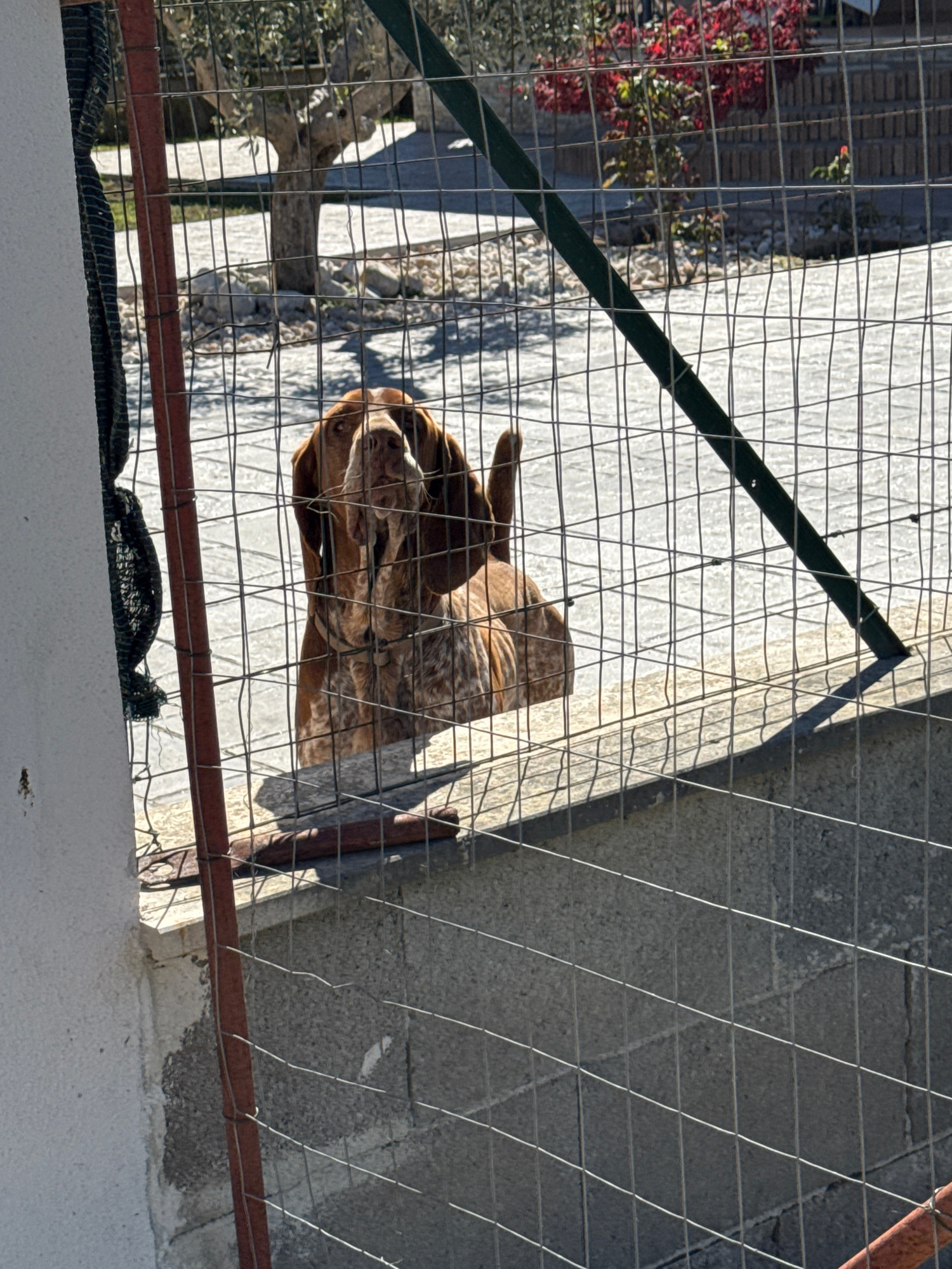 The image appears to be taken from an elevated perspective, looking down into an enclosed area. A dog with brown and white speckled fur is lying on a concrete surface, partially visible through a wire…read more