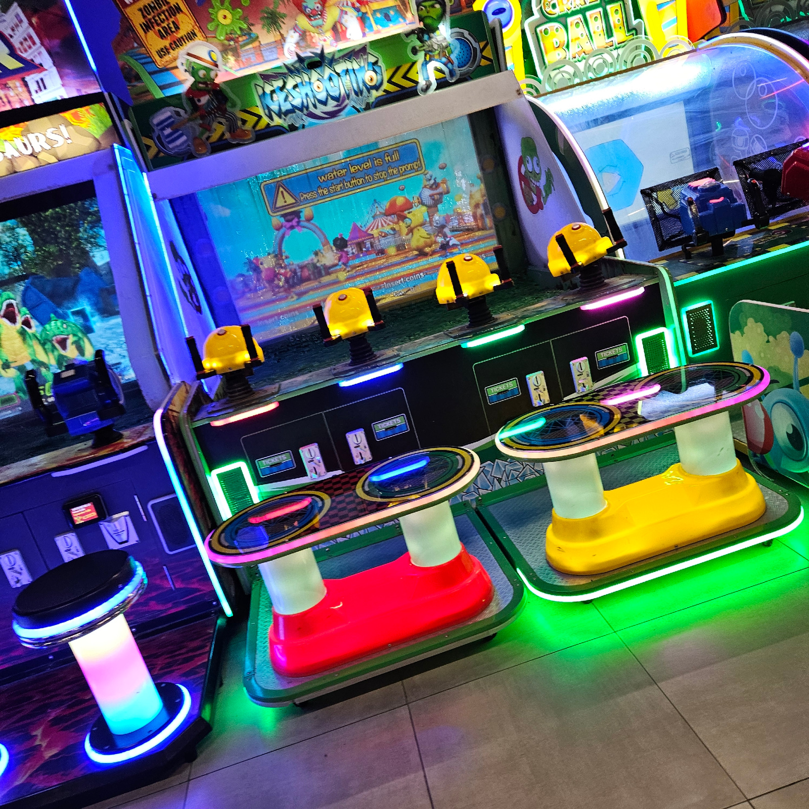 The image shows several brightly lit arcade-style water gun game machines in an indoor entertainment setting. The machines are adorned with cartoonish graphics featuring zombie and dinosaur themes. Ea…read more