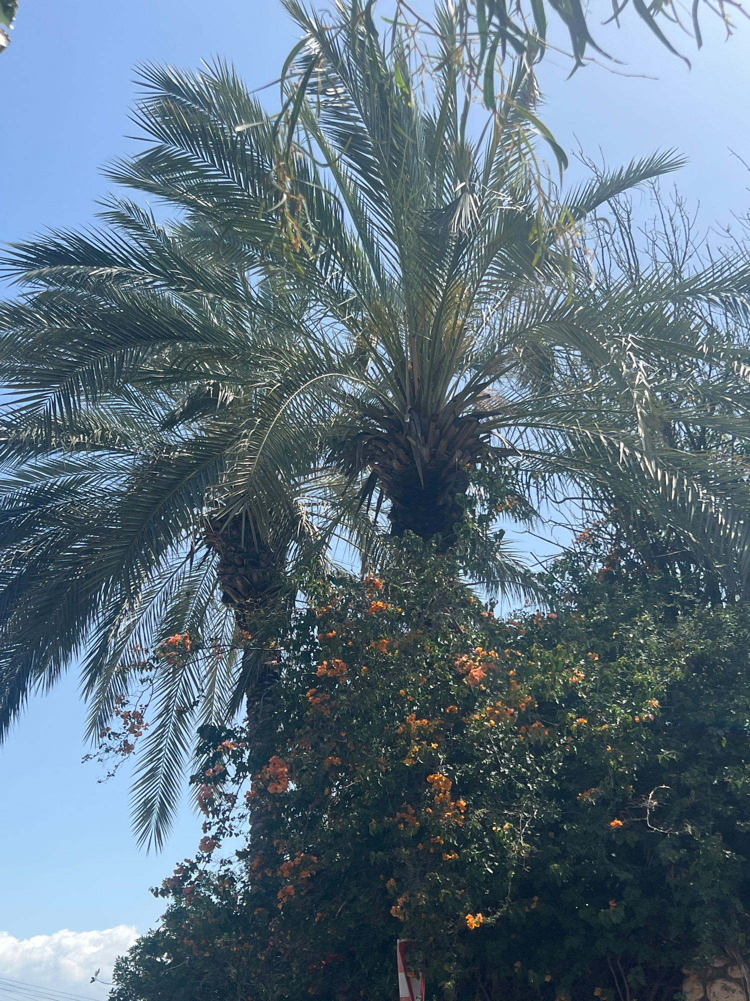 The image shows a view looking up at a date palm tree and a flowering vine with orange blossoms. The blue sky is visible through the branches. The image seems to be captured in the city of Al Jizah, J…read more