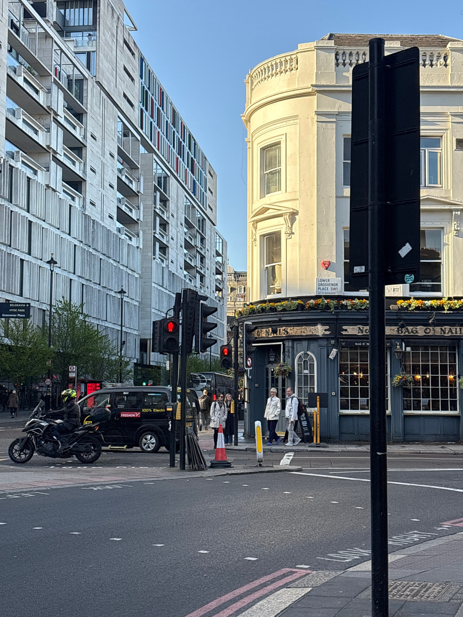 The image captures a street scene in London, United Kingdom. A multi-story building with distinctive architectural features stands on one side of the street, while a traditional pub-style building, "B…read more