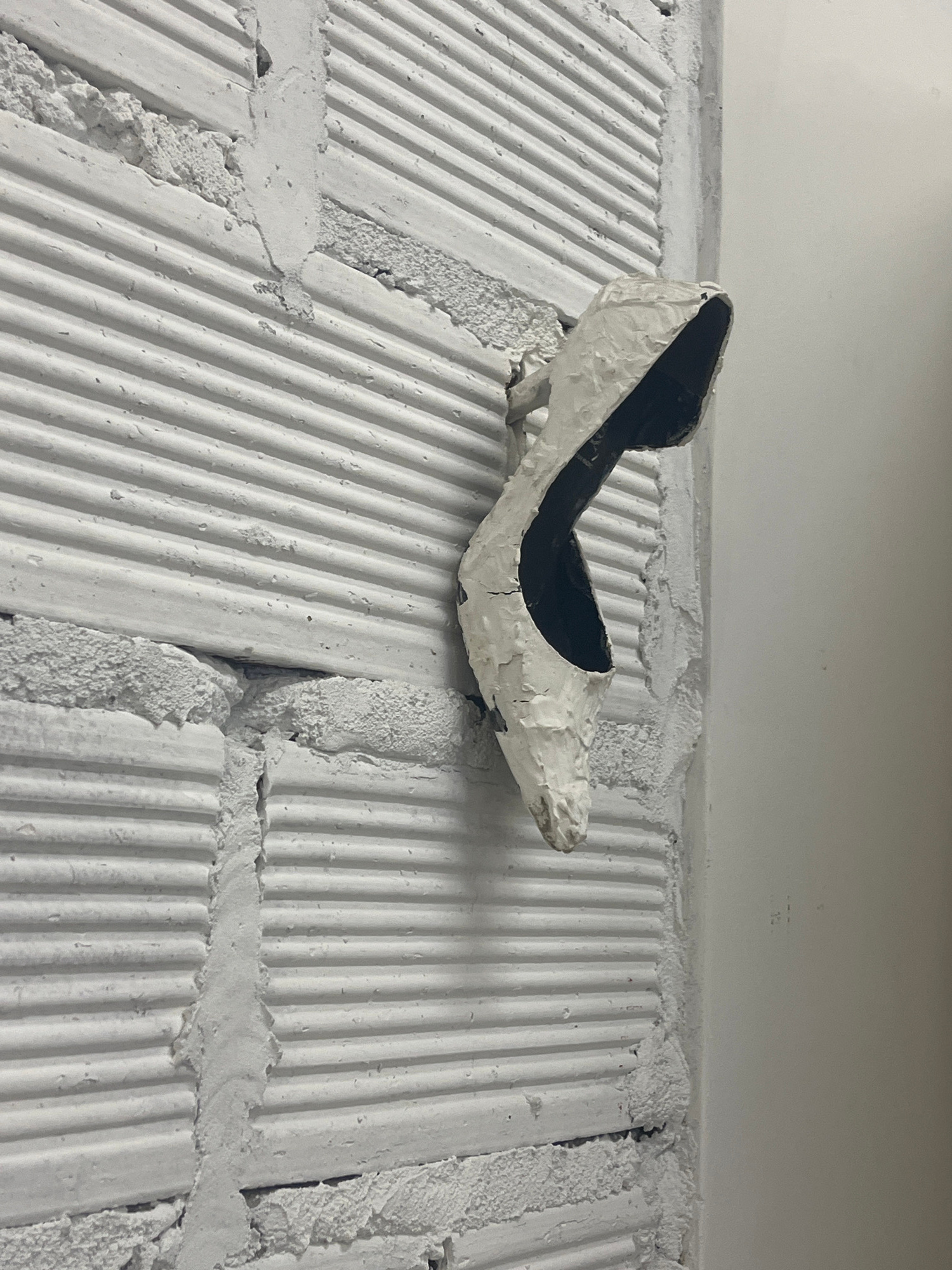 A white, damaged high-heeled shoe sits atop a section of painted white brickwork. The shoe has a dark interior. The brickwork has a ridged texture and is laid in a block pattern with rough, irregular…read more