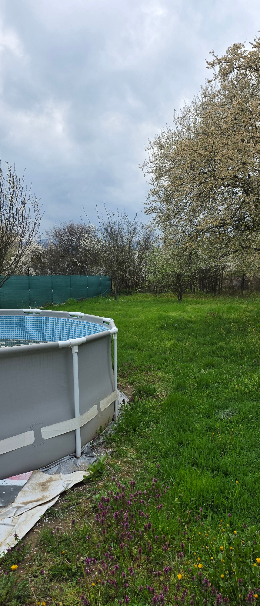The image depicts an above-ground swimming pool situated in a yard. The pool is gray with a blue tiled interior pattern visible. A white frame supports the pool. The yard is grassy, with areas of gree…read more