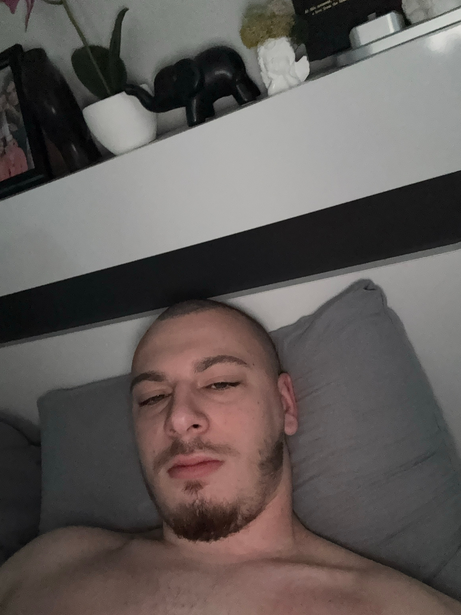A man is lying on a grey pillow in an indoor setting. He has short hair, a beard, and appears to be shirtless. To the left of the pillow is a white and black cabinet or wall unit. Items visible on theβ¦read more
