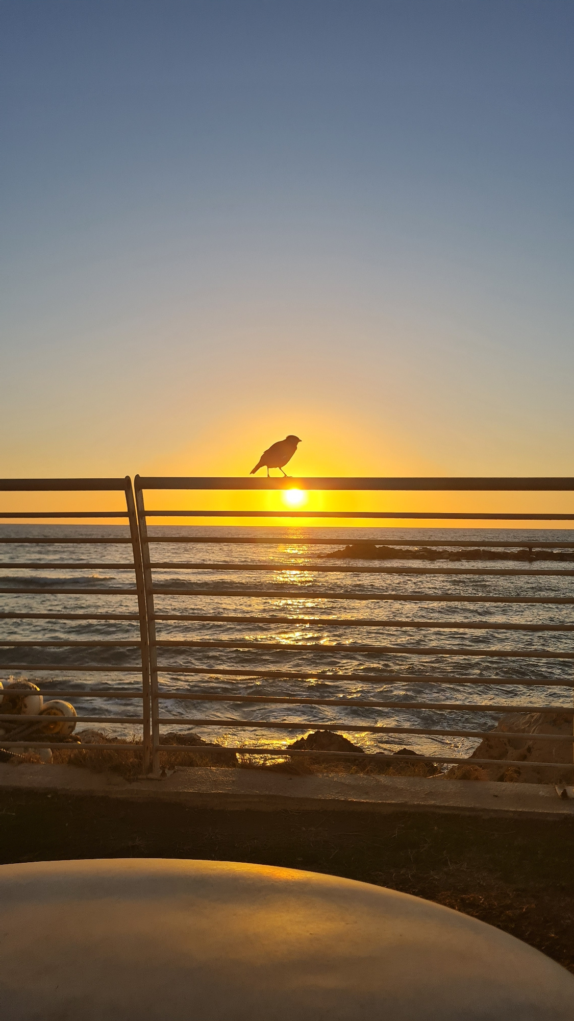 A bird is silhouetted against the setting sun, perched on a metal railing overlooking the Mediterranean Sea. The railing is constructed of vertical and horizontal bars. The sea reflects the golden sun…read more