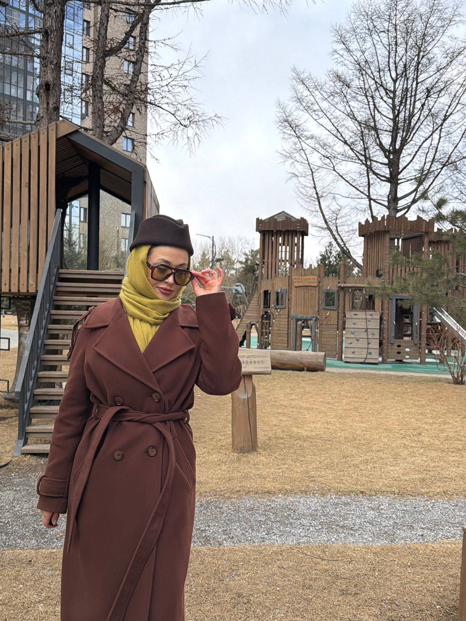 A woman wearing a brown coat, brown hat, yellow scarf, and sunglasses stands outside near a playground. The playground is made of wood and has multiple levels. A gravel path and trees are also visible…read more