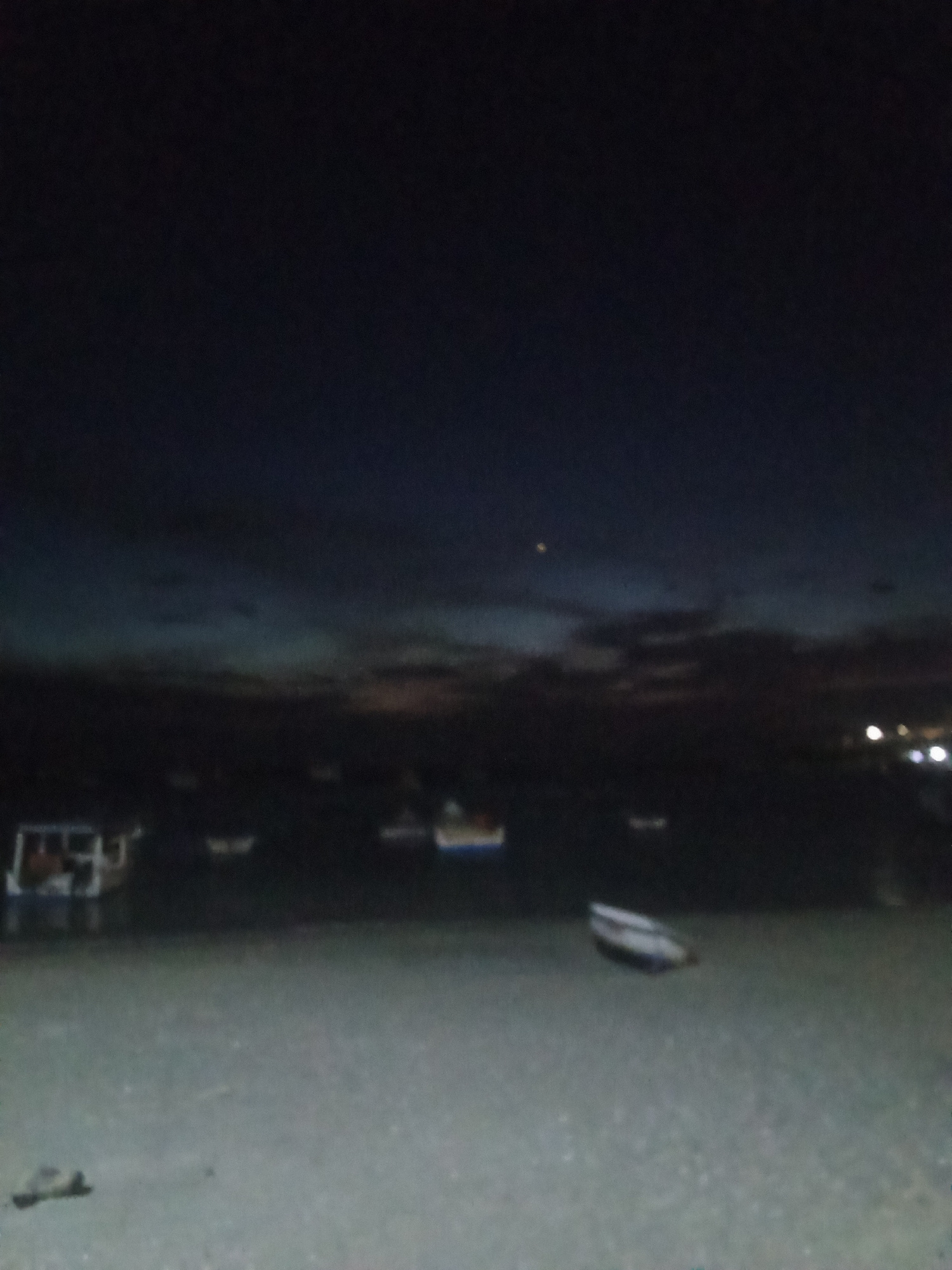 The image shows a nighttime scene at the beach in Juan Griego, Venezuela. Several boats are visible in the water, some closer to the shore. The sky is dark, with faint signs of sunset or artificial li…read more