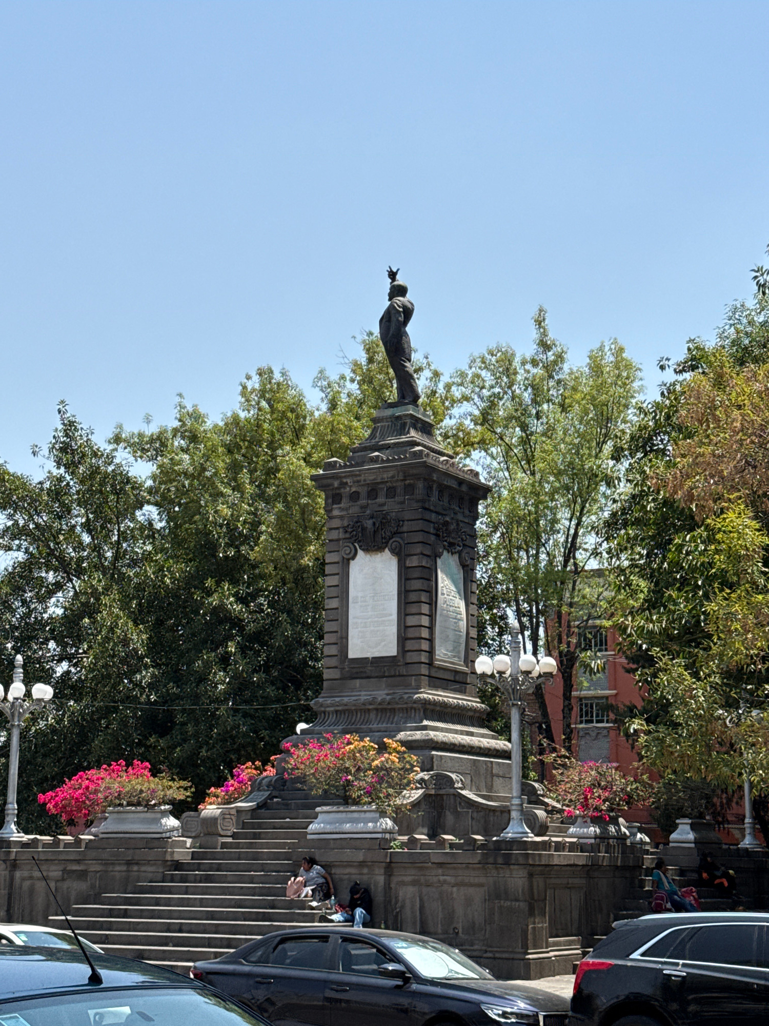 The image captures a sunlit urban scene centered around a tall, ornate monument. Atop the monument stands a statue of a figure, possibly male, with one arm extended, set against a clear, light blue sk…read more