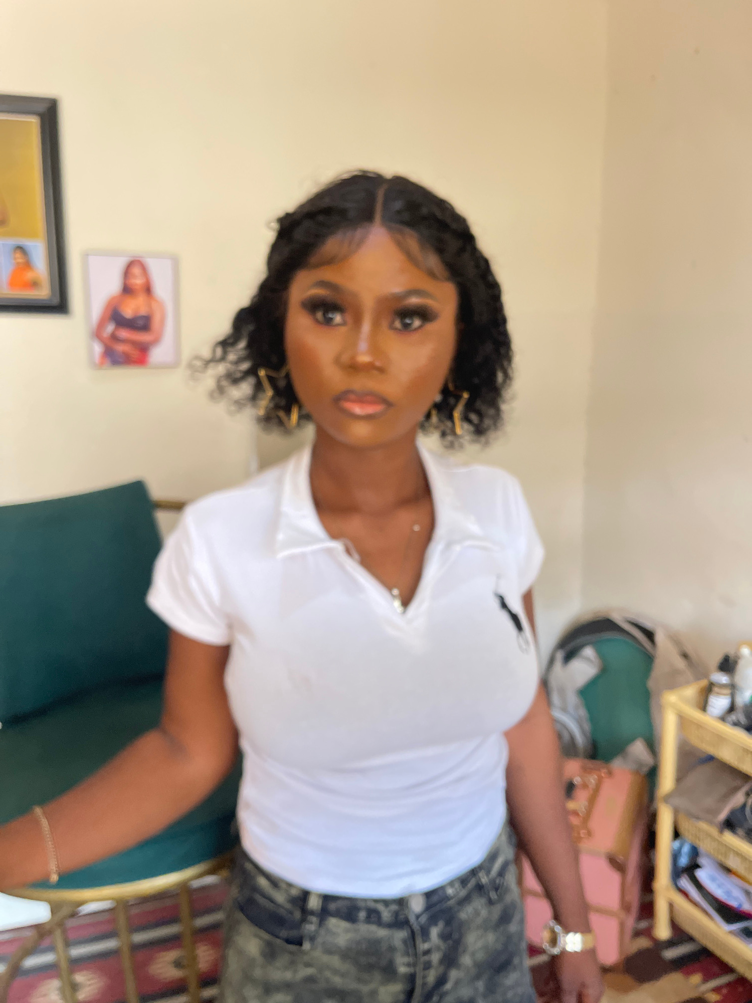 The image is an indoor portrait of a young woman, taken in Akwanga, Nigeria. She has dark skin and short, dark, curly hair styled with a visible side part. She is wearing a white short-sleeved collare…read more