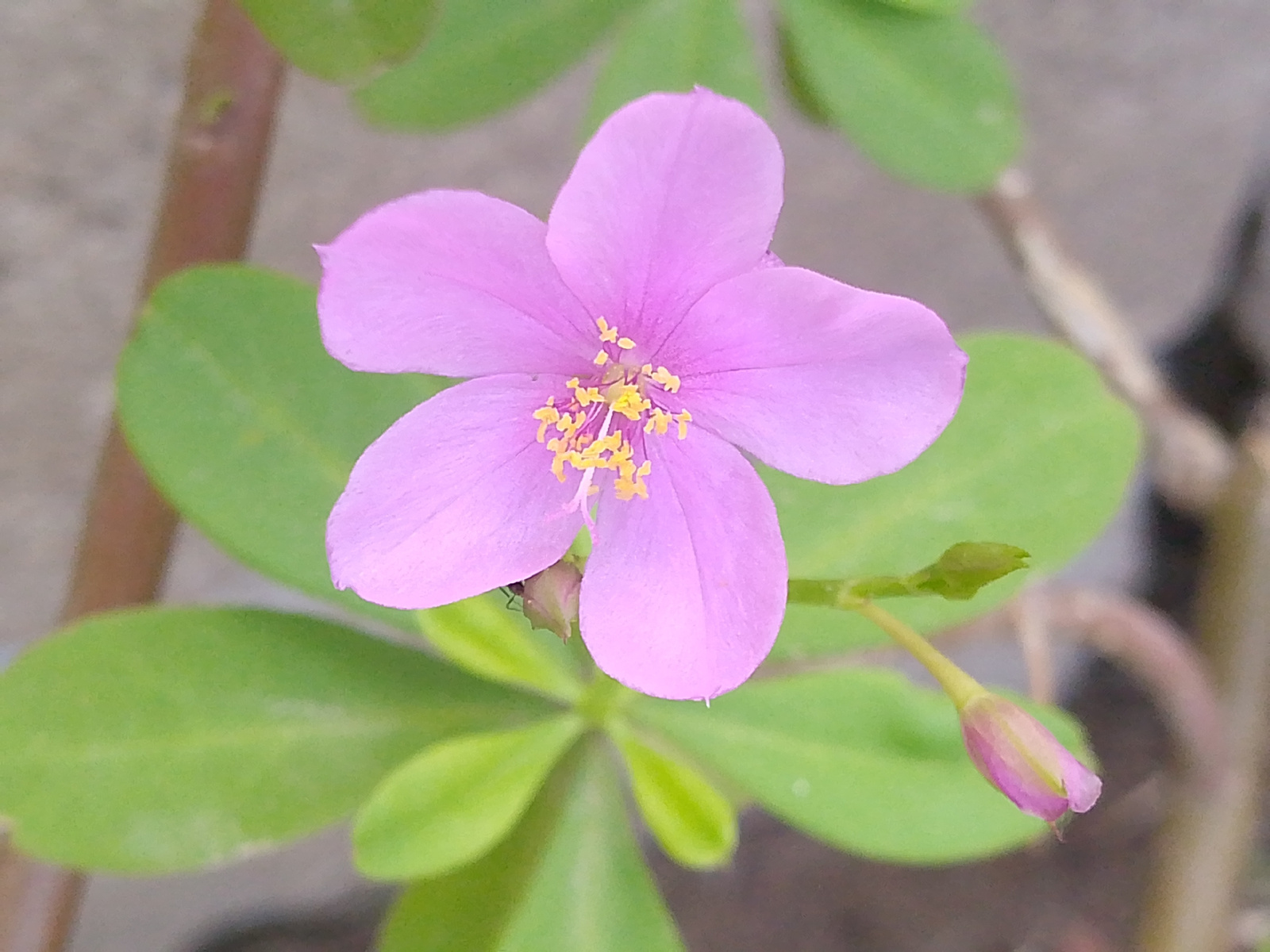 A close-up image depicts a single, open flower with five pink-lavender petals and a central cluster of yellow stamens. A small, dark-colored insect is visible on the underside of the lower-left petal.…read more