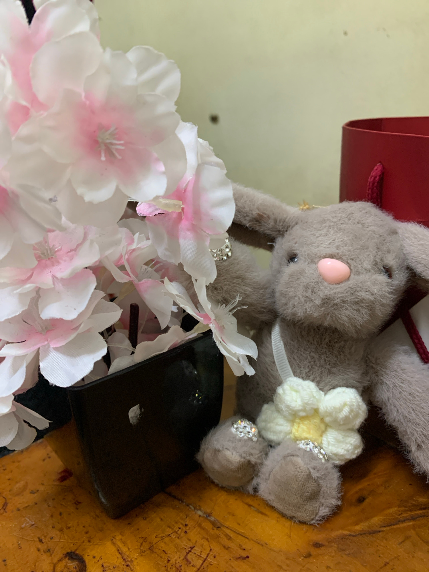 A still life photograph presents a fuzzy grey bunny toy with a pink nose, adorned with a white crocheted flower and gem-like embellishments. The bunny sits atop a dark, rectangular object, possibly a…read more