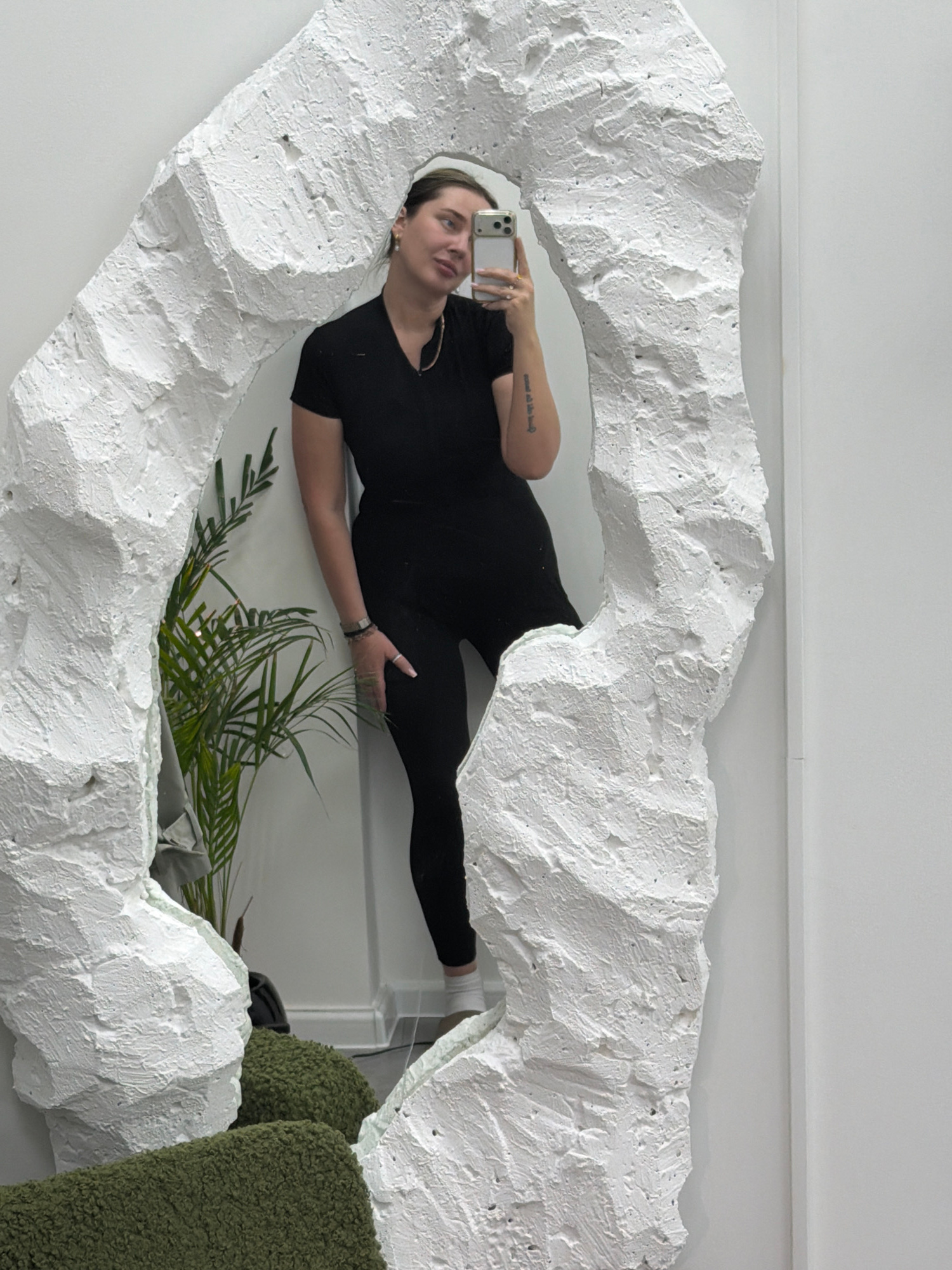 A woman in black leggings and a black t-shirt lies on her side in front of a mirror. She holds a white smartphone in her hand, ostensibly taking a picture. The mirror has an irregular, organic shape,…read more