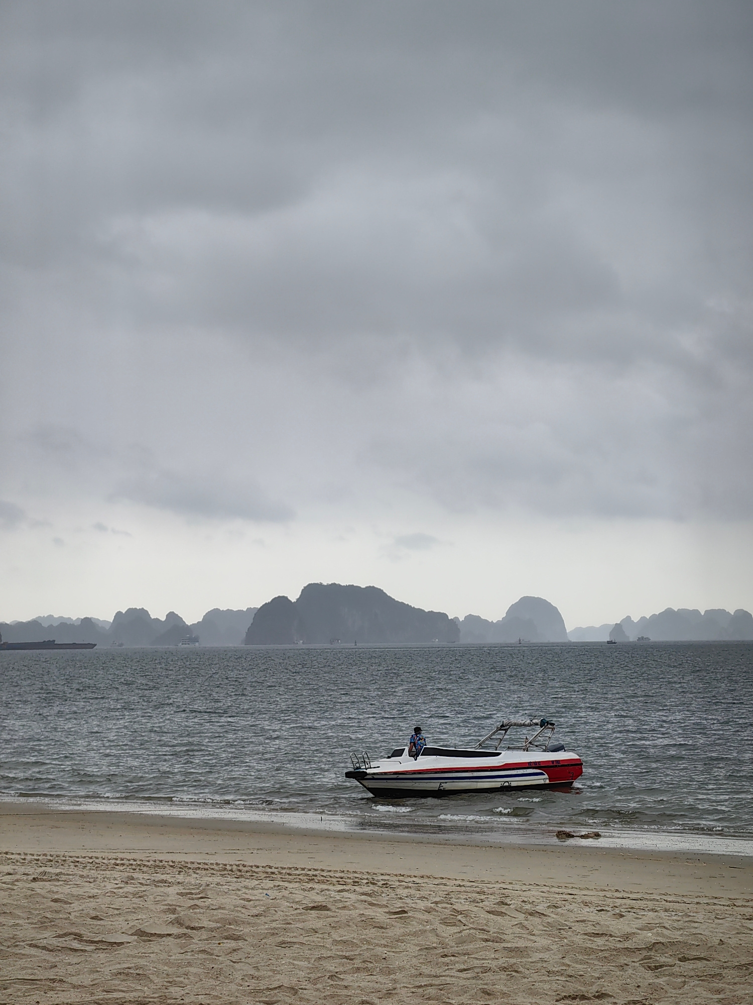 The image shows a beach scene in Bai Chay Ward, Vietnam, with a motorboat partially beached on the sand. The boat is white with red and blue stripes and a man sits on its edge. In the background, the…read more