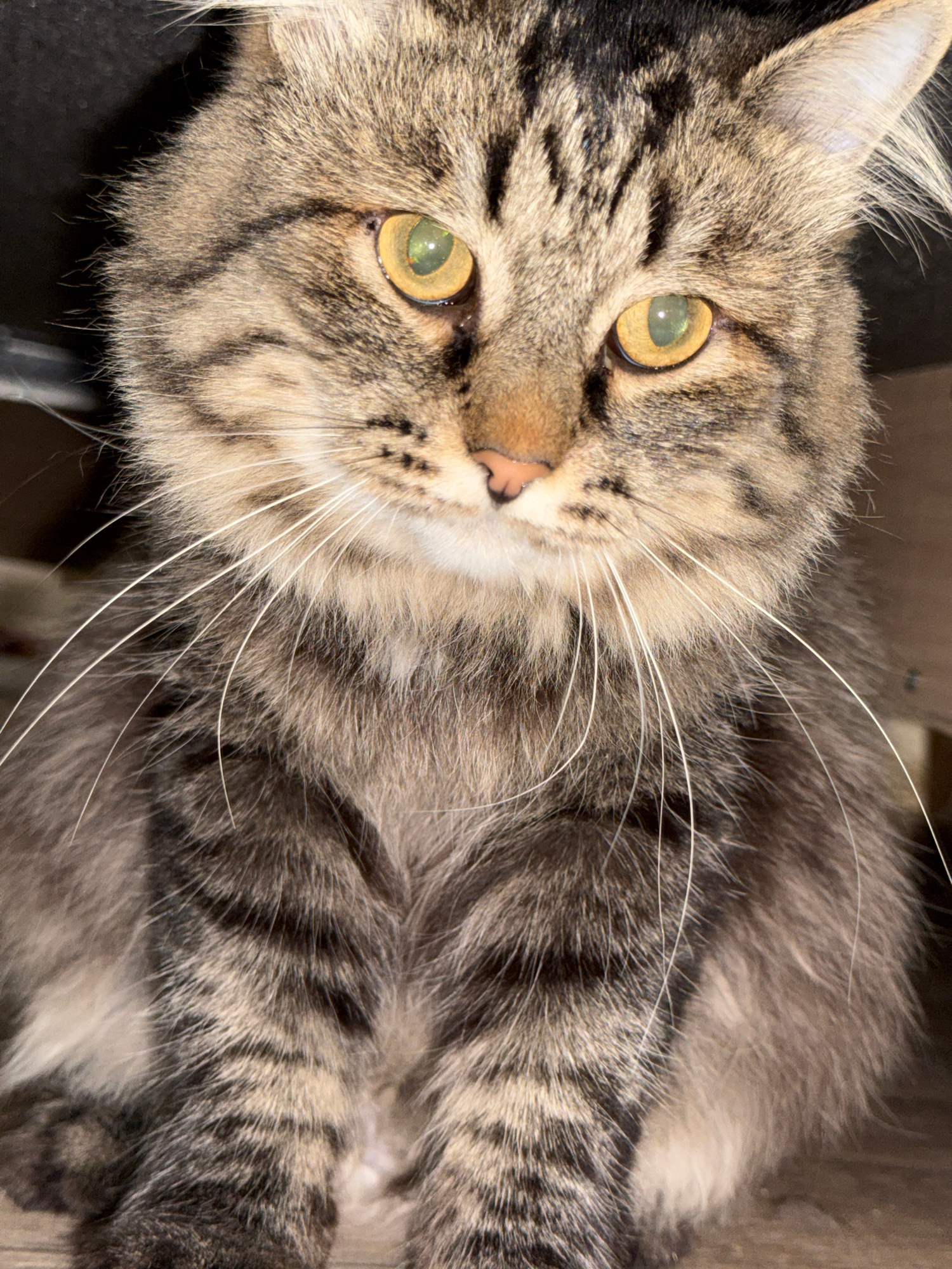 A close-up of a brown and grey tabby cat is shown, lying on its back. The cat's face is turned towards the viewer, and its eyes are greenish-yellow. It has long white whiskers. The fur has a striped p…read more
