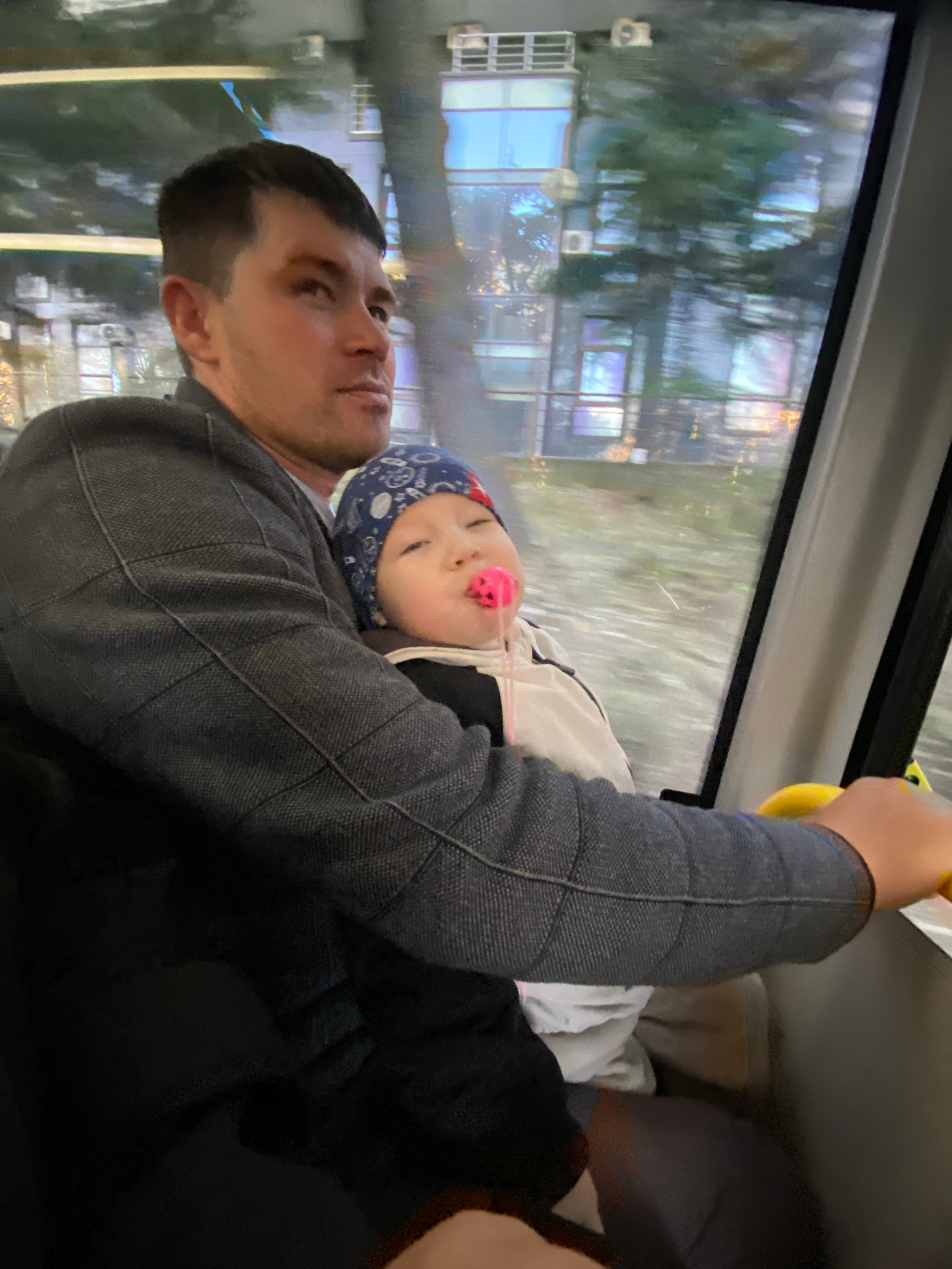 The image shows a man on a bus in Sochi, Russia. He is holding a baby who is wearing a blue bandana and has a pink pacifier in their mouth. The man is wearing a dark jacket and holding onto a yellow h…read more