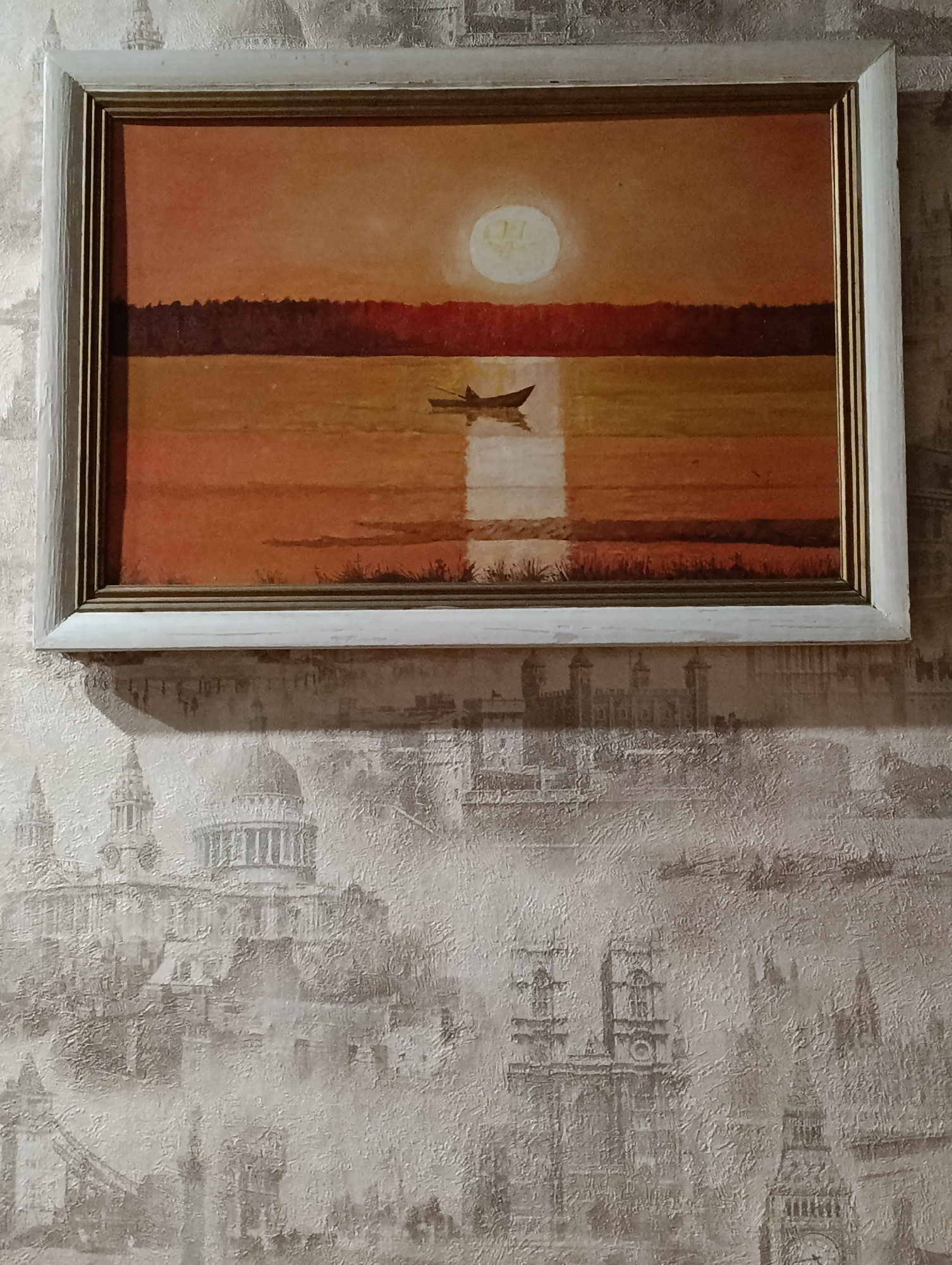 A framed painting hangs on a textured wallpaper featuring a cityscape, likely depicting London. The painting depicts a sunset over water, with a silhouetted boat in the center of the water and the sun…read more