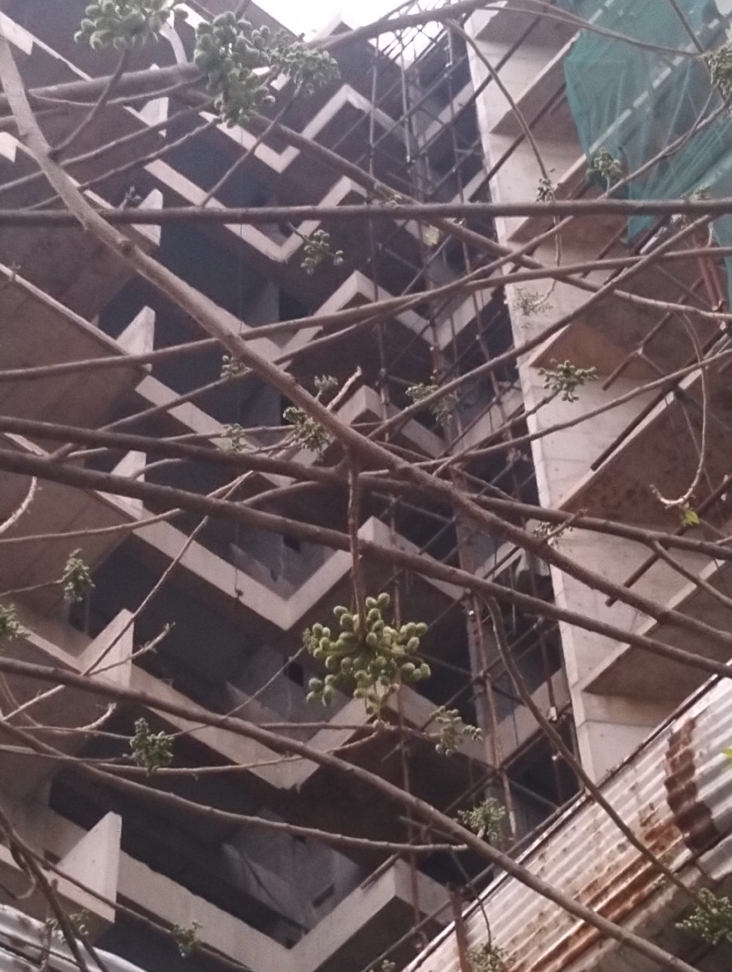 The image shows the facade of an unfinished multi-story building, obscured by tree branches with small green fruit or buds. The building's structure is visible, with repeating geometric patterns of co…read more