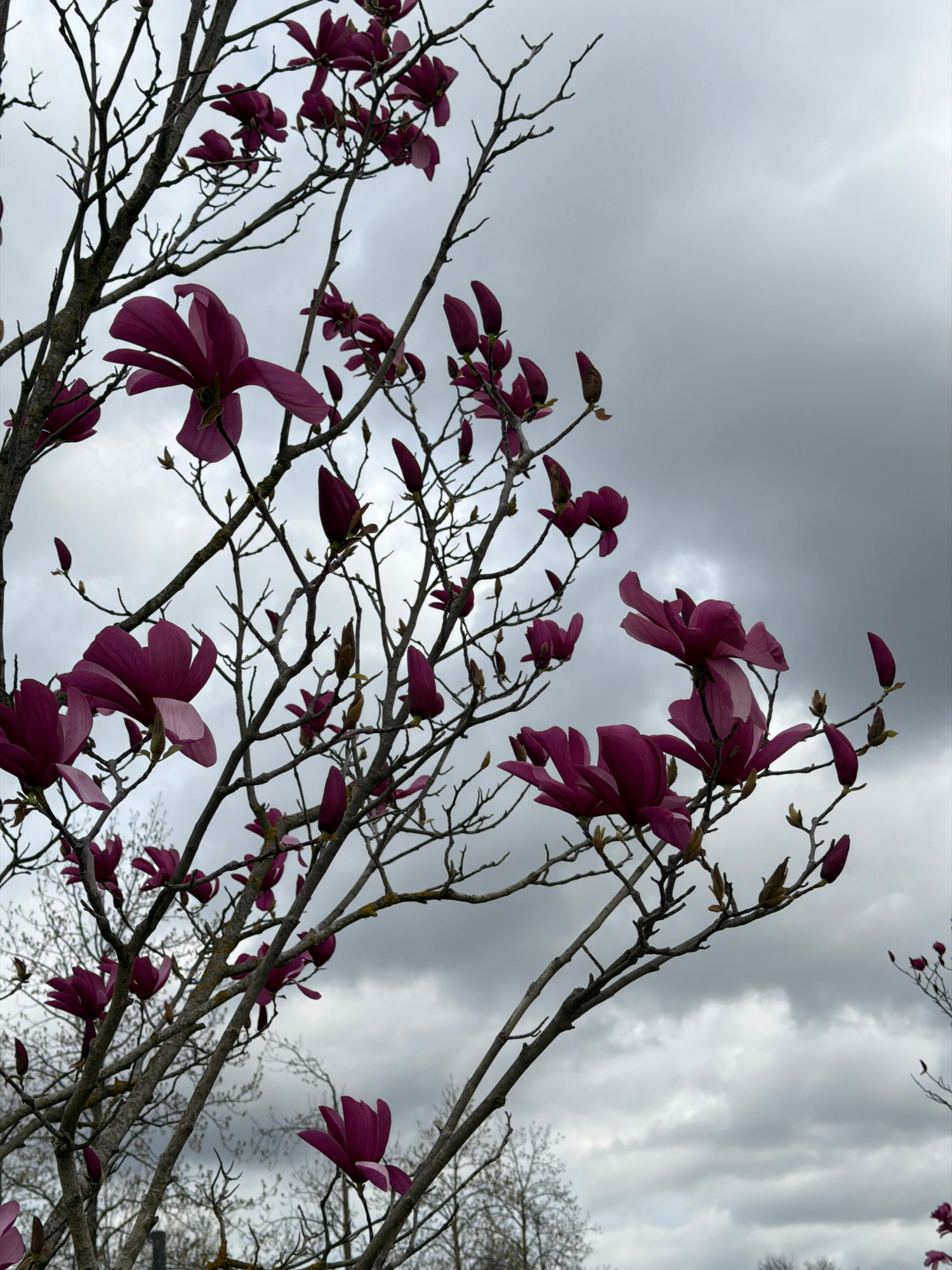 The image shows a low-angle view of bare tree branches with vibrant, deep pink or magenta flowers blooming against a backdrop of a gray, overcast sky with dramatic cloud formations. The flowers appear…read more
