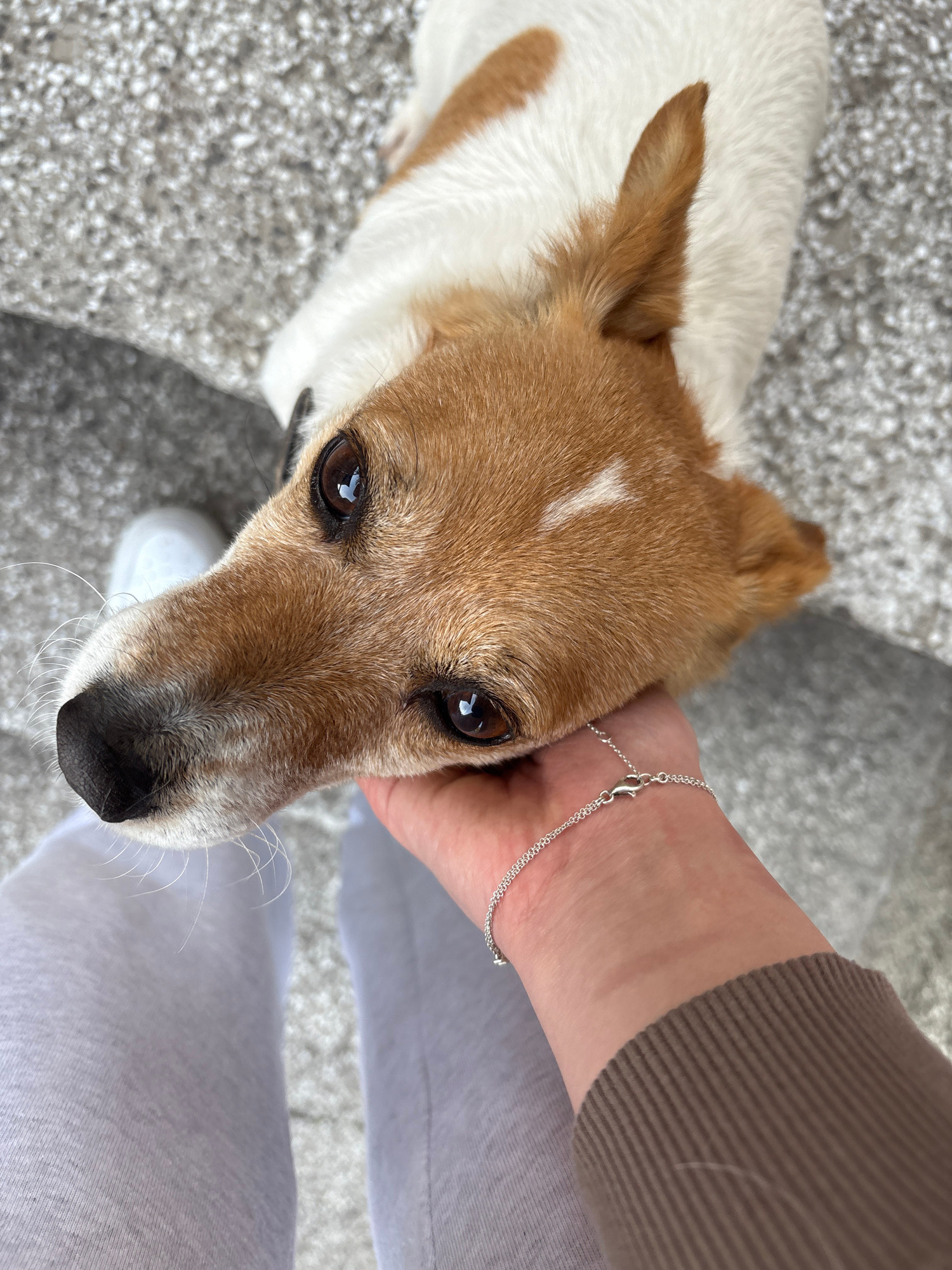 A close-up, high-angle shot shows a brown and white Jack Russell Terrier with a black collar looking up at the camera. A hand with a silver bracelet rests on its head. The person wearing the bracelet…read more