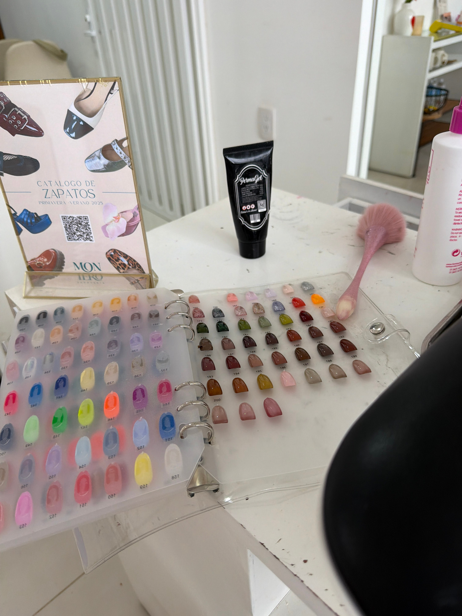 The image shows a table surface with various beauty and cosmetic-related items. There is a bottle of pink liquid, a pink fluffy brush, a black tube of 'Perma Gel' product, and two nail polish color ch…read more