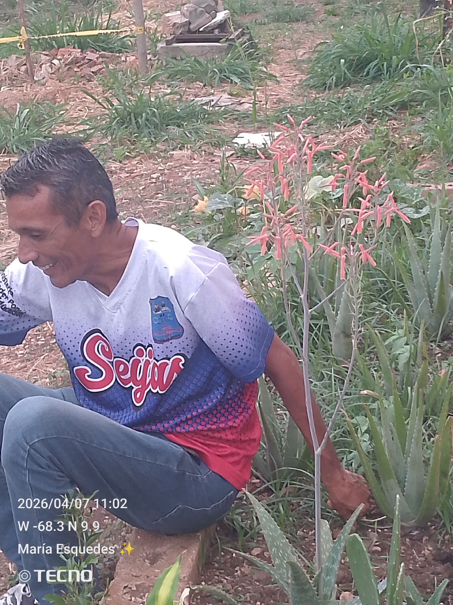 An adult man is seated amongst a collection of Aloe Vera plants and a blooming aloe vera plant with light pink flowers, likely in a garden setting. The timestamp indicates the image was taken on Aprilβ¦read more