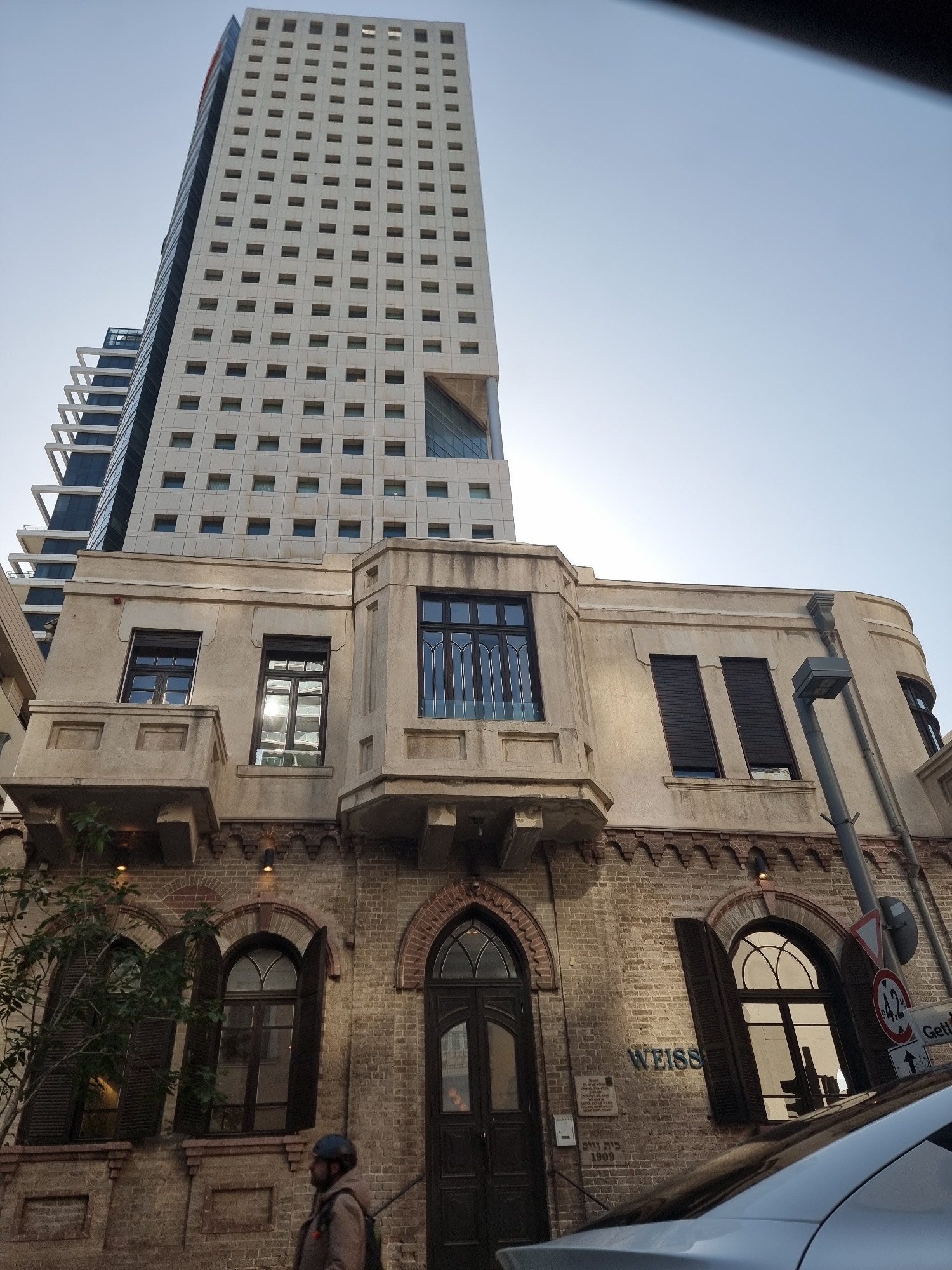 The image presents a street view in Tel Aviv, Israel. On the right, an older building is constructed with brick and beige accents featuring arched windows and the signage "WEISS". The building is atta…read more