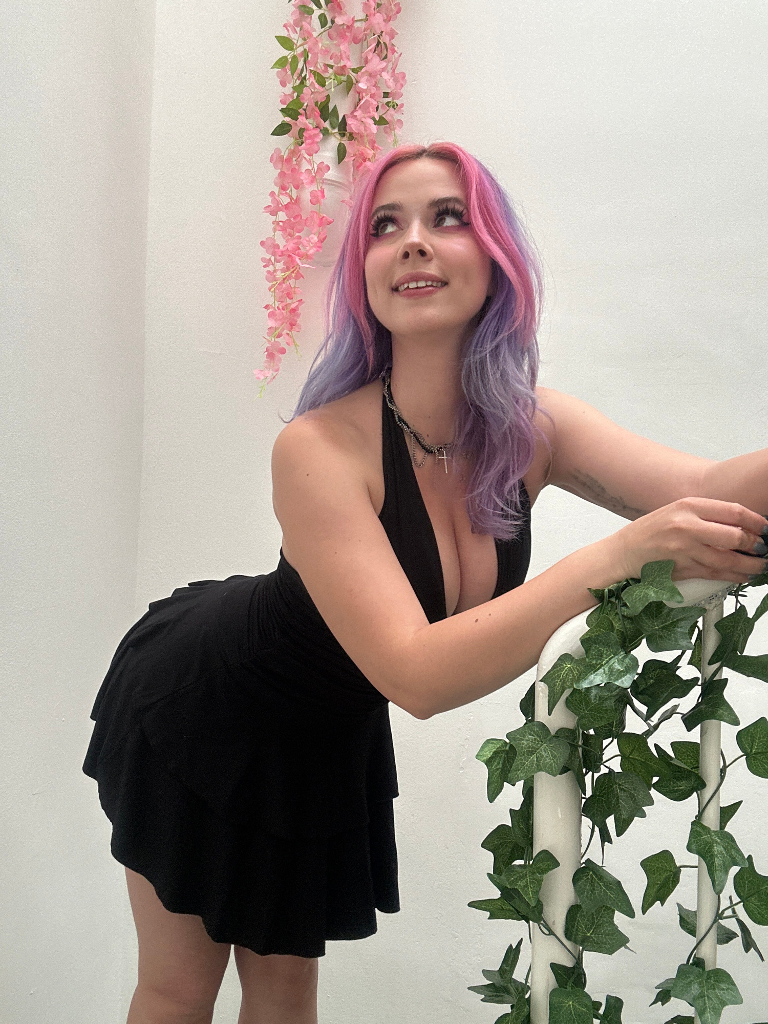 A young woman with striking long hair, colored in pink and purple ombre, is the central subject of this indoor portrait. She is wearing a black, deep V-neck mini-dress and a silver chain necklace with…read more