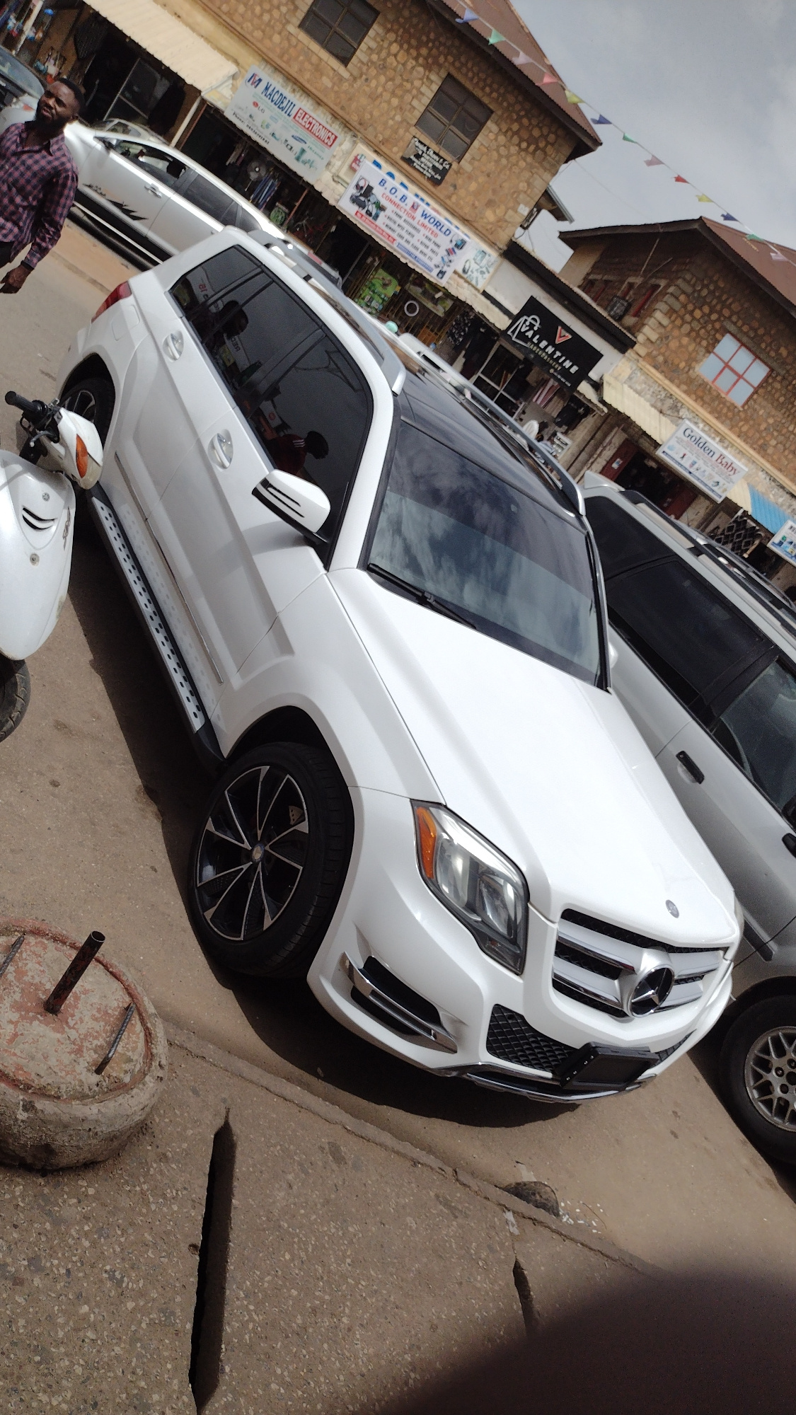 A white Mercedes-Benz SUV is parked on the side of a street lined with buildings featuring stone facades. The location is Jos, Nigeria, based on the presence of local businesses such as "B.O.B World C…read more