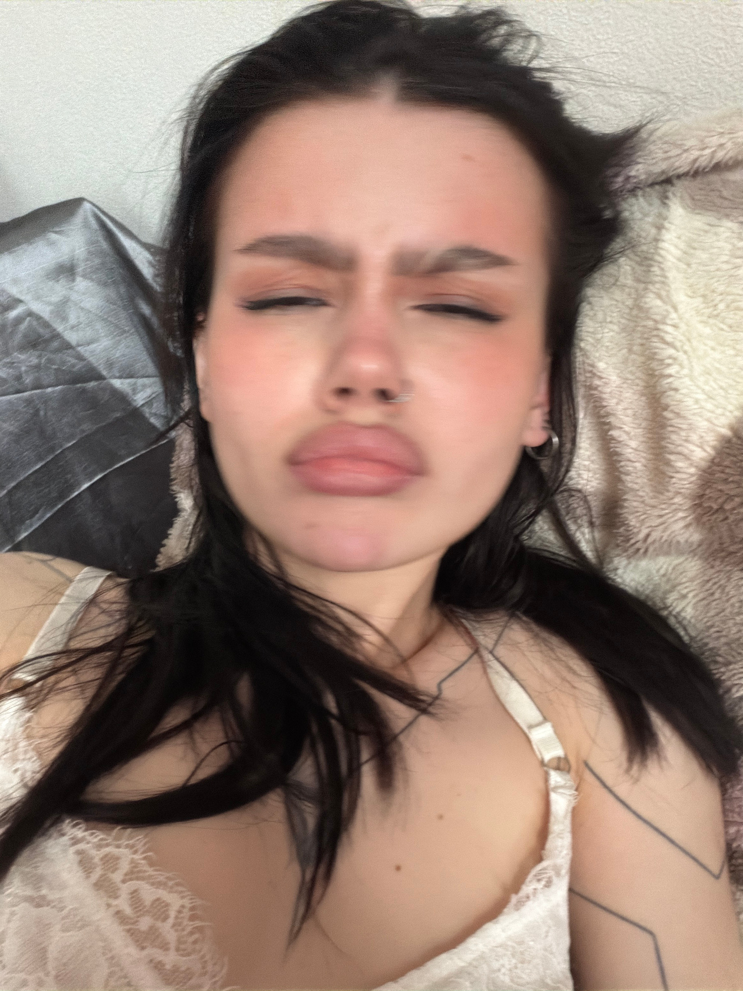 A woman with dark hair lies on a bed. She sticks her tongue out. The bedding appears to be a mix of light beige and silver-grey materials. She wears a white lace garment. A tattoo is visible on her ar…read more