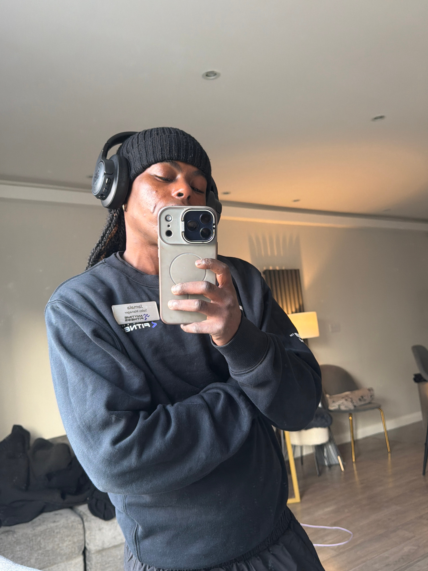 A person is taking a selfie in a room with neutral-colored walls and a light-colored ceiling. The person is wearing a black beanie, headphones, and a black sweatshirt with a "Lifetime Fitness" name ta…read more
