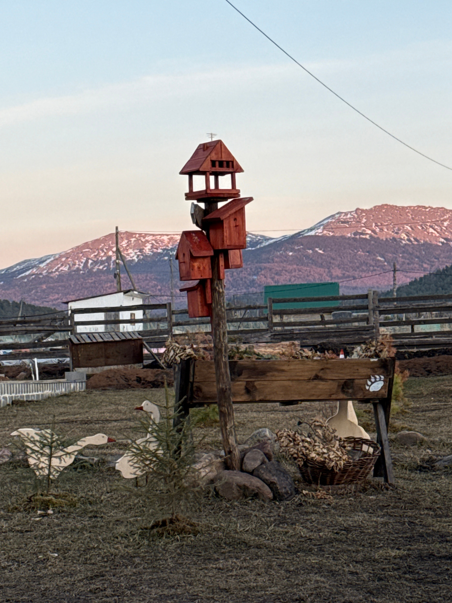 This outdoor shot depicts a birdhouse resembling a multi-tiered structure, atop a wooden post. Adjacent to it, wooden geese stand amidst dense greenery, adding a decorative touch. In the background, a…read more