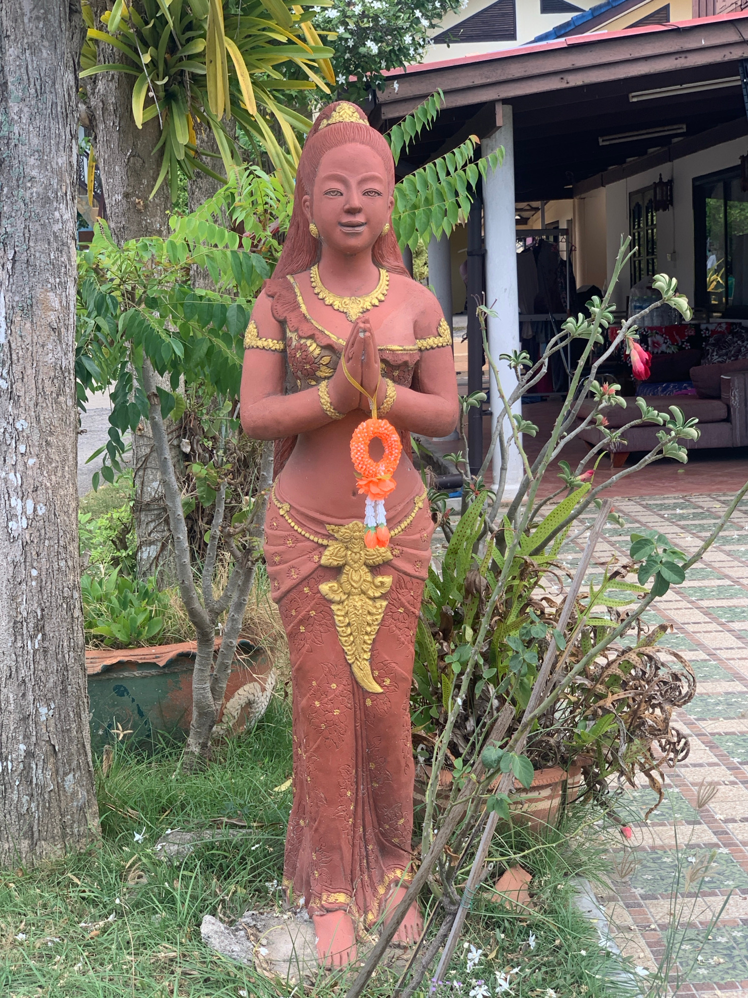 A terracotta statue of a female figure, dressed in traditional Thai attire with golden embellishments, is the focal point of the scene. She holds a garland of orange and white flowers in front of her.…read more