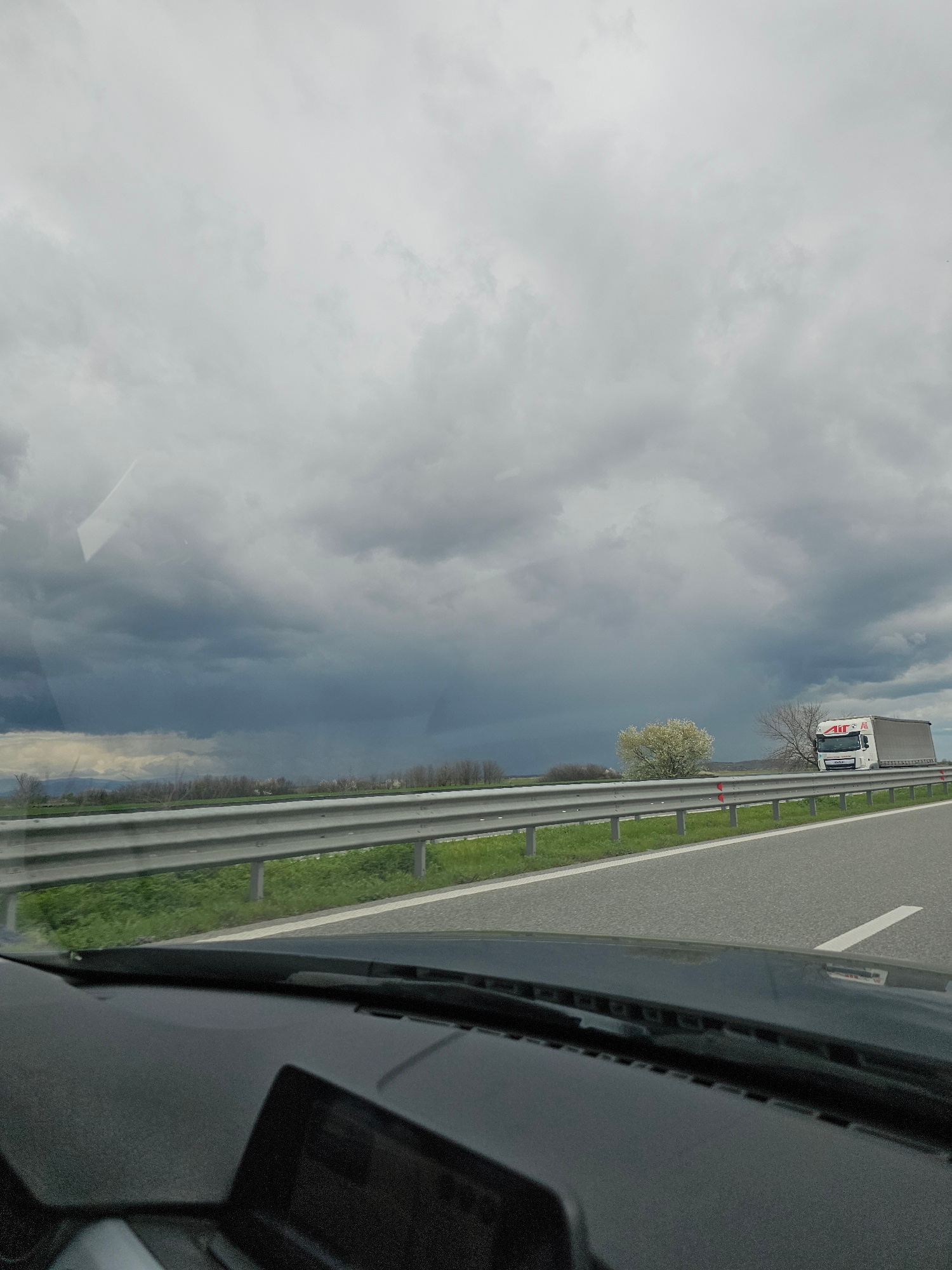 The image shows a view from inside a vehicle on a highway near Manolsko Konare, Bulgaria. The vehicle is moving along the roadway. A truck is visible in the adjacent lane. A metal guardrail runs alongβ¦read more