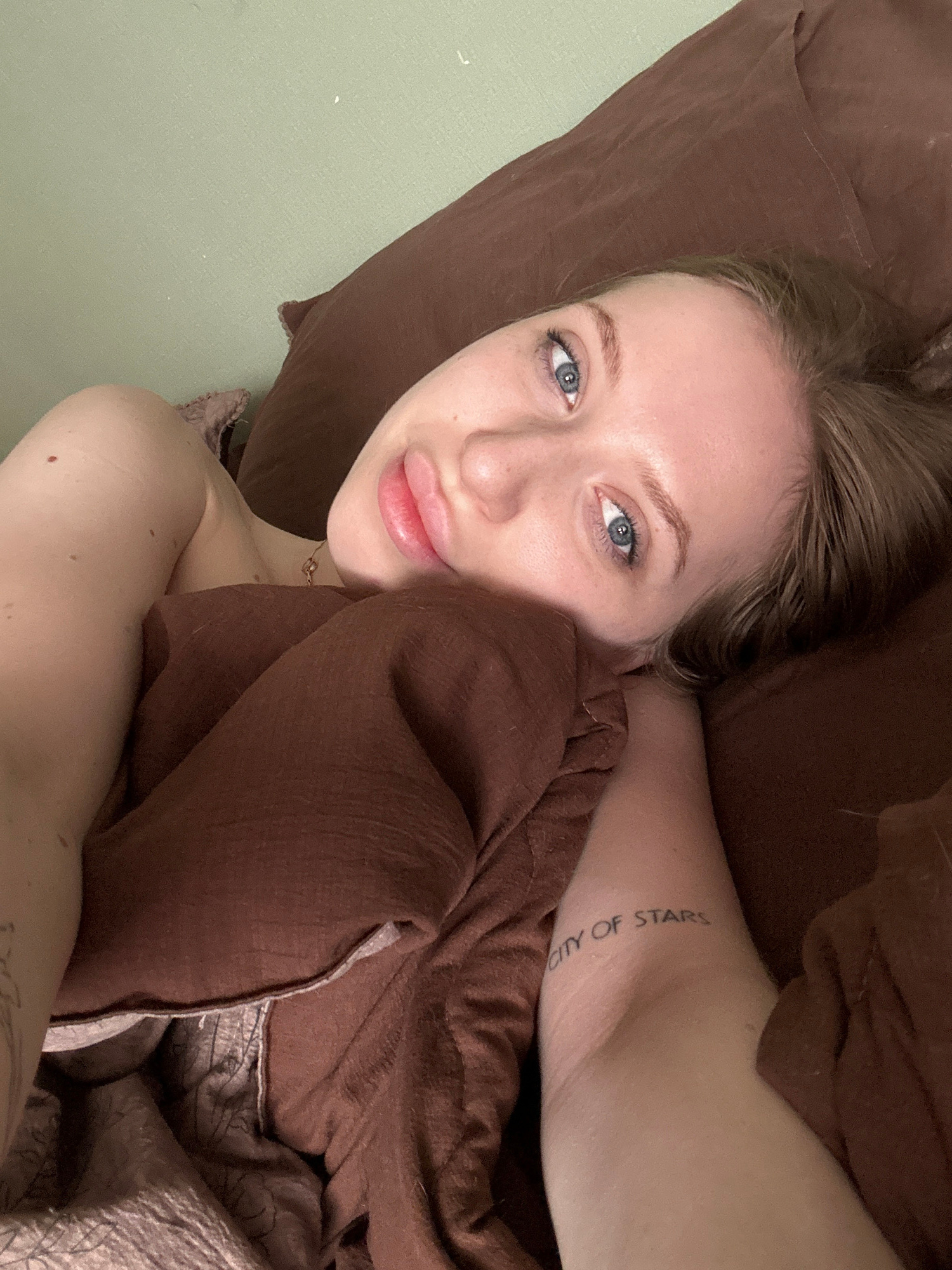 A young woman lies in bed, her head resting on a brown pillow. She has fair skin, blonde hair pulled back from her face, and blue eyes. Her lips are full and slightly parted. A brown blanket or garmen…read more