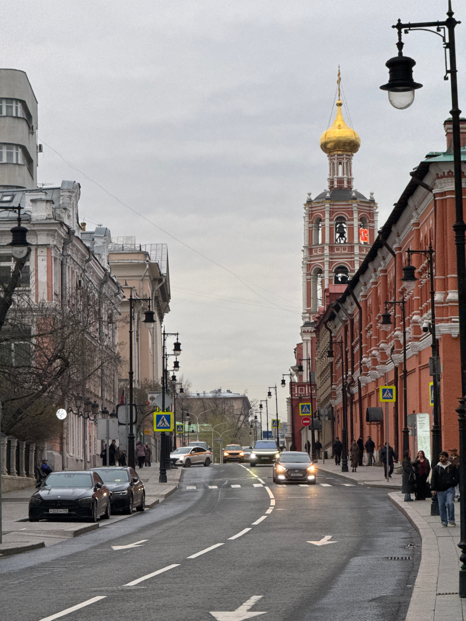 The image depicts a street scene in Moscow, Russia, featuring a view of the Petrovka Street leading towards the High-Petrov Monastery. The street is lined with buildings of varying architectural style…read more
