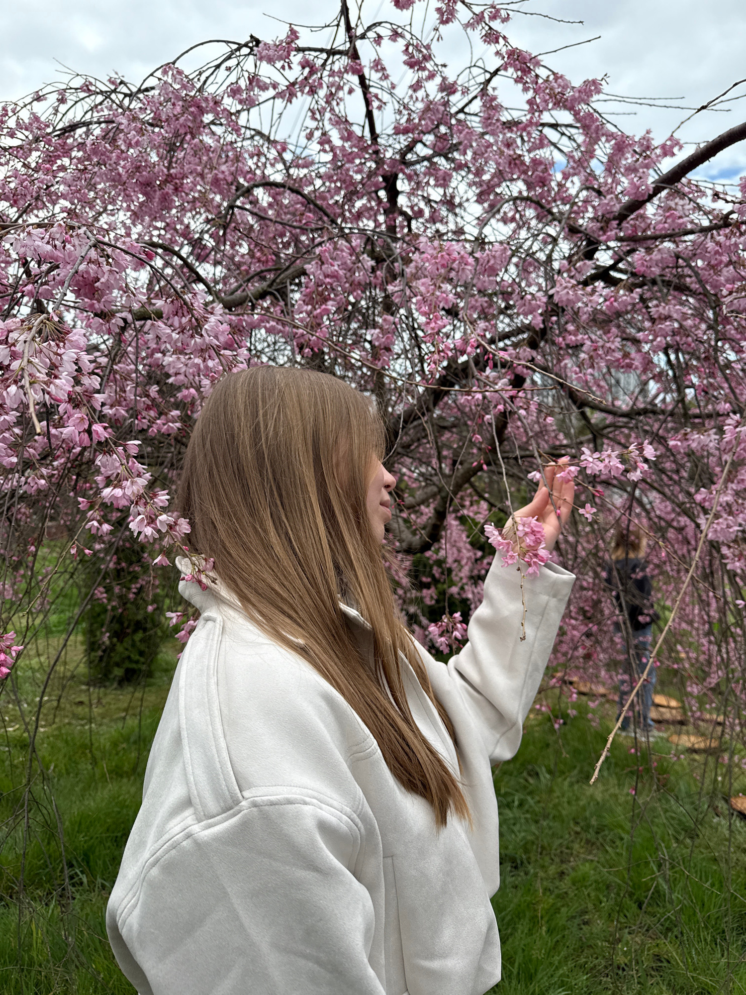 An outdoor scene in Sochi, Russia, features a young individual with long, light brown hair, viewed from the right profile. The individual wears a light-colored, long-sleeved jacket and is extending th…read more
