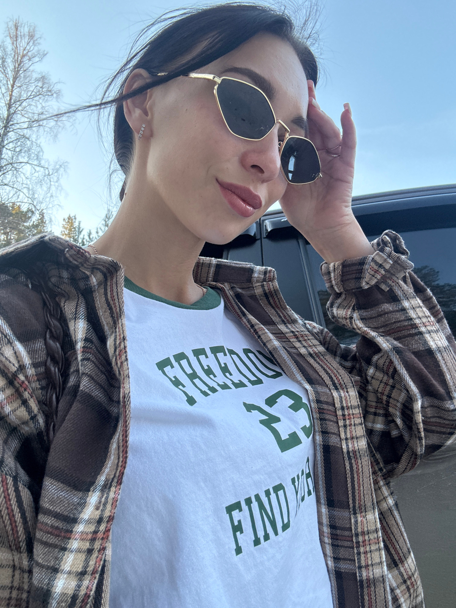 A young woman wearing a brown and tan plaid button-down shirt over a white t-shirt with green lettering poses for a selfie outdoors. She is wearing gold-rimmed sunglasses and an earring. Her dark hair…read more