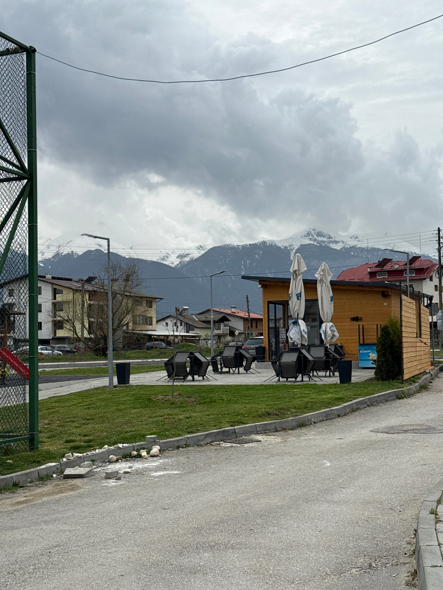 The image displays a tranquil street scene in Razlog, Bulgaria, characterized by mountainous surroundings and an overcast sky. The view is taken from a slightly elevated position, looking down a paved…read more