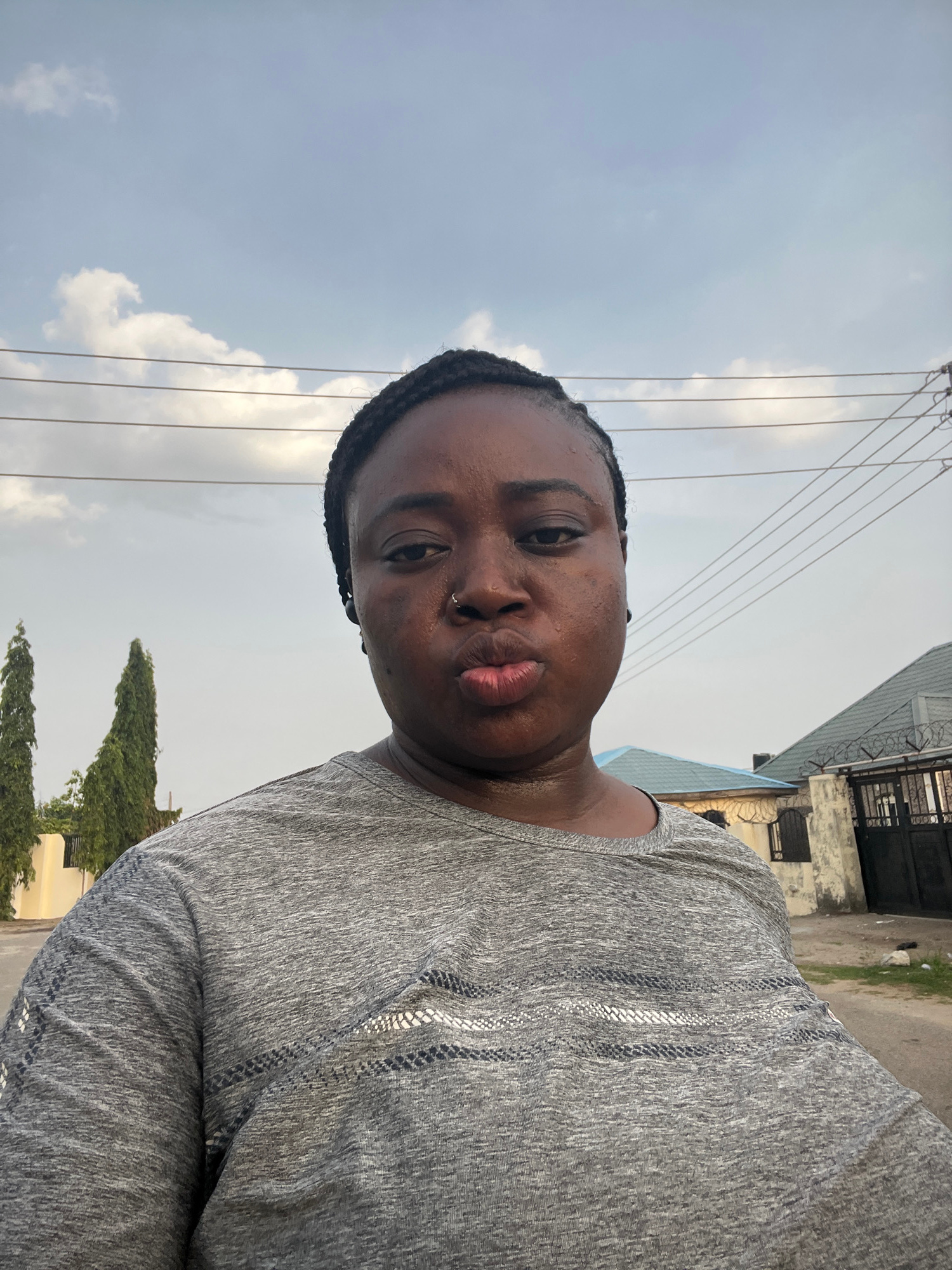 An outdoor low-angle shot reveals a dark-skinned person with their face in focus. They are wearing a gray shirt with vertical dark stripes accented by silver. The person's hair is styled in braids. Th…read more