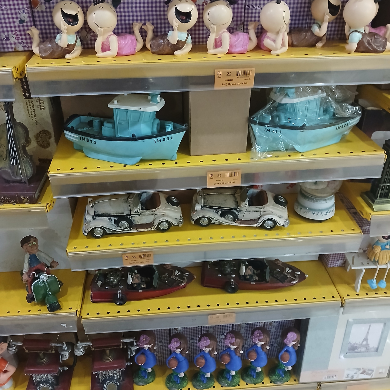 The image shows several shelves in a store in Gaza, Palestinian Territory. The shelves are yellow and contain various novelty items. The first shelf has figurines of babies. The second shelf has model…read more