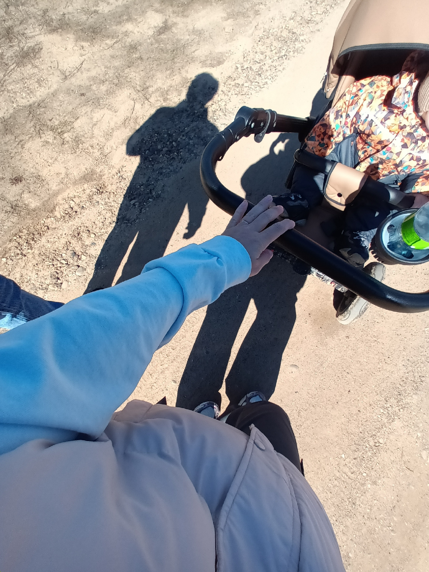 The image depicts a top-down view of a person pushing a stroller on a dirt path in Ольховка, Russia. The stroller contains a child. The person pushing the stroller is wearing a light blue sweatshirt a…read more