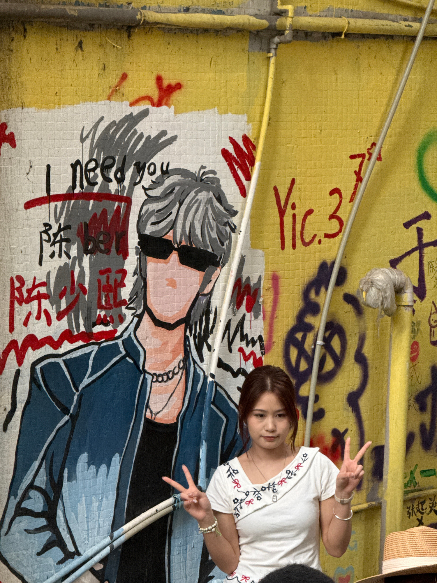 A young woman is posing in front of a wall mural in Jiulongpo District, China. The wall is covered in yellow tiles and graffiti. In the foreground, a mural depicts a stylized person wearing sunglasses…read more