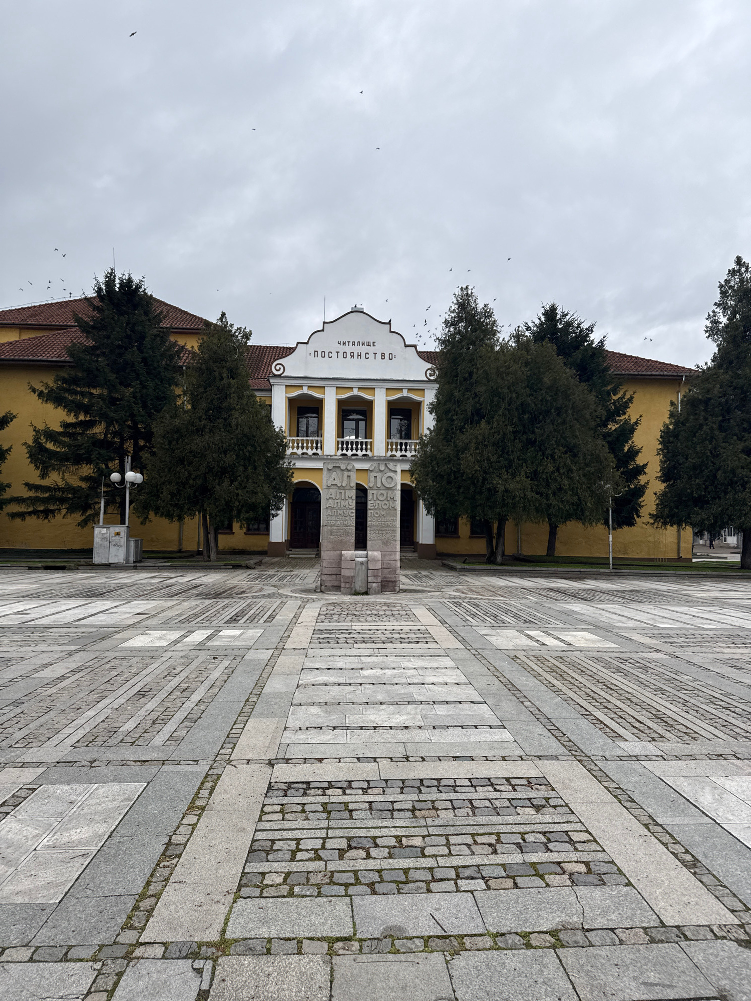 The image depicts the building of the "Chitalishte Postoyanstvo" cultural center in Lom, Bulgaria. The building is two stories tall, painted yellow, with a white facade featuring the center's name inβ¦read more