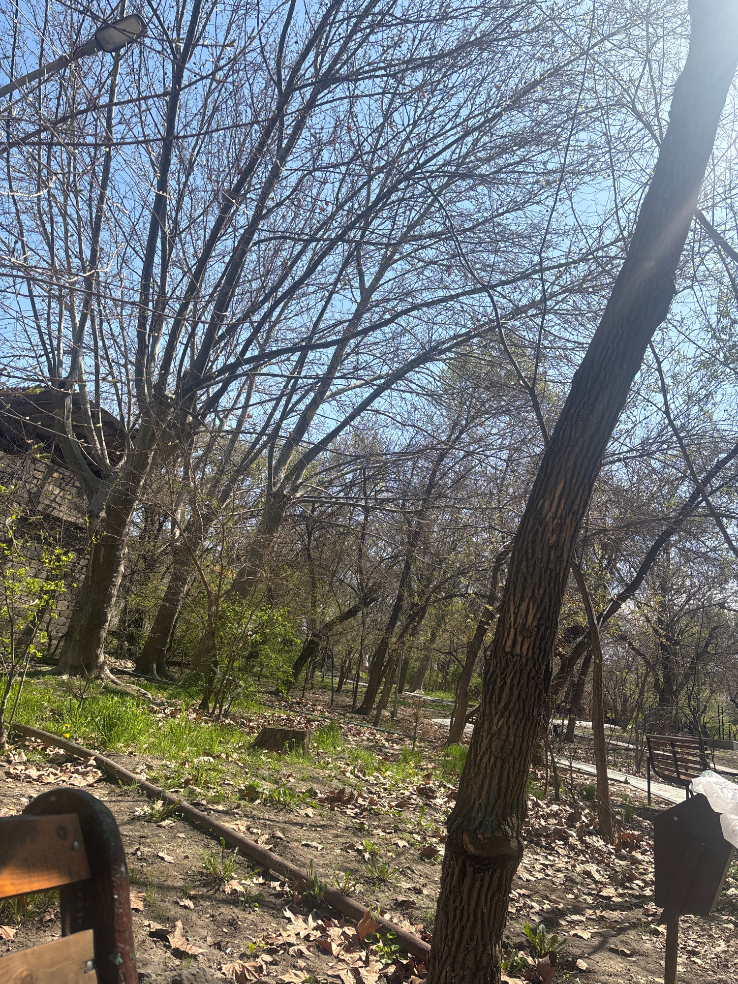 This image captures a tranquil park or wooded area, likely in early spring in Yerevan, Armenia. The scene is dominated by numerous trees with intricate networks of bare branches reaching towards a cle…read more